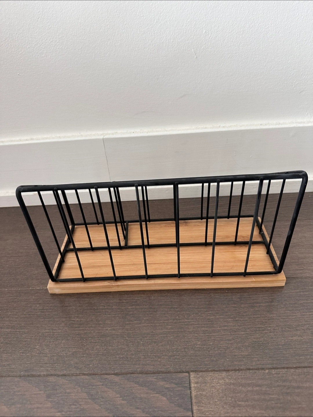 Stylish desk organiser. Black wire frame with bamboo base. Multiple compartments for pens, notebooks, and other stationery. Perfect for home or office.