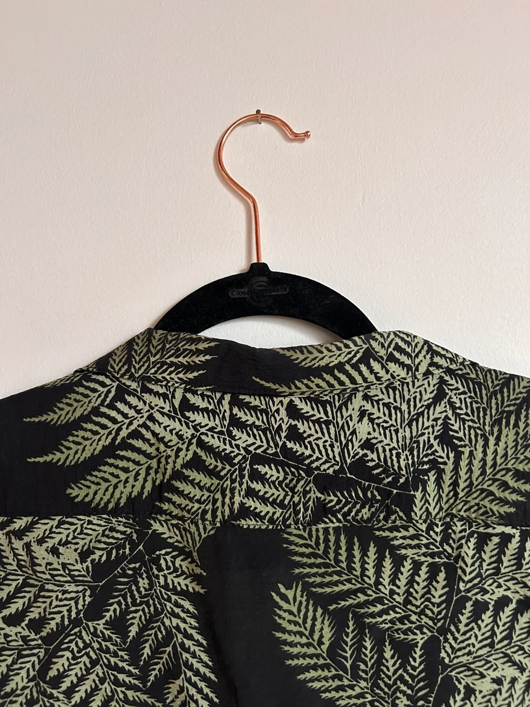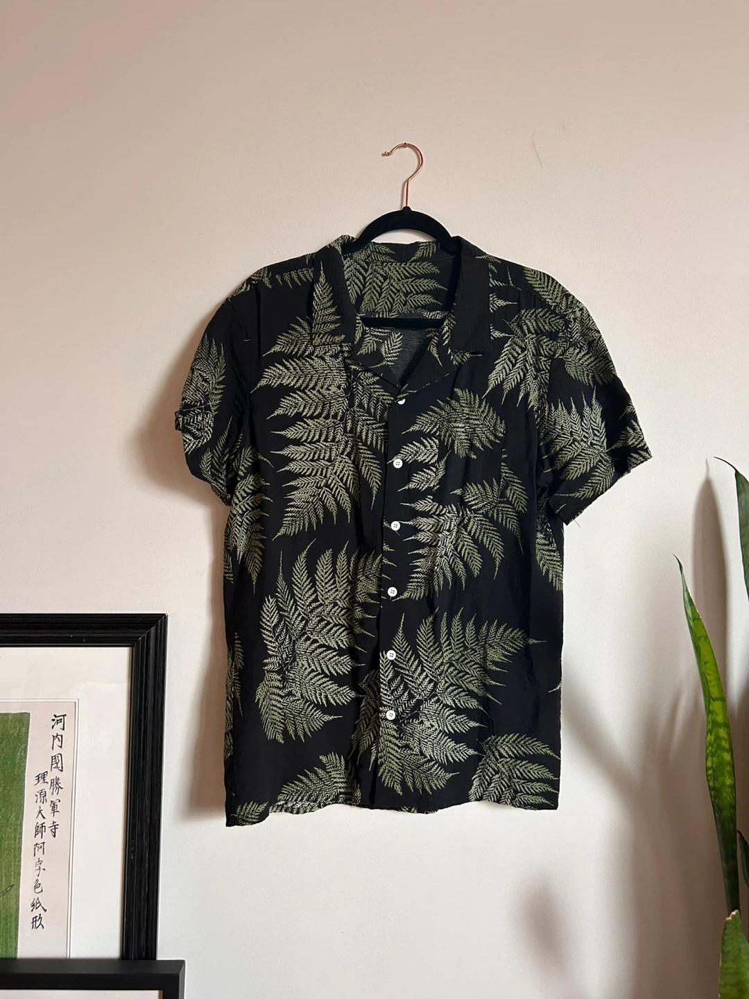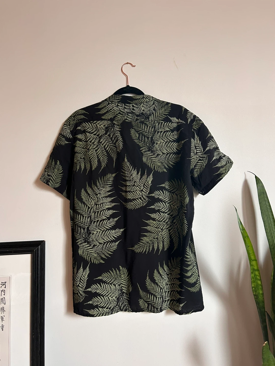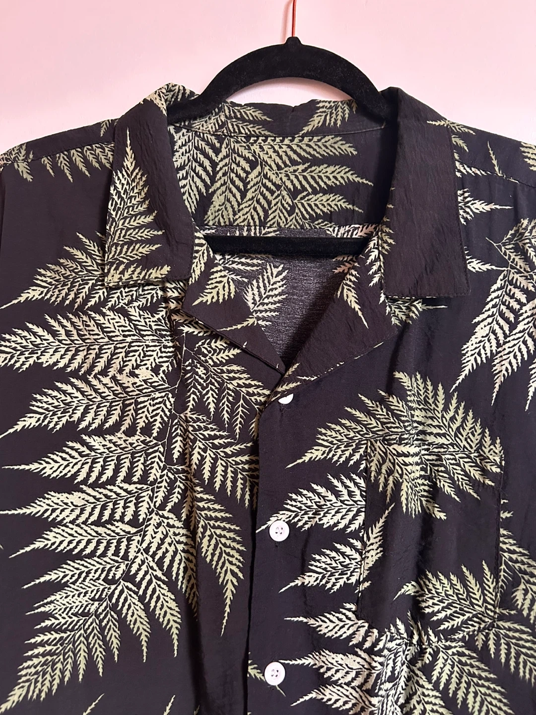 A black short-sleeve button-up shirt with a green fern print. It features a classic collar and button closure. This shirt is great for casual wear or a tropical vibe!