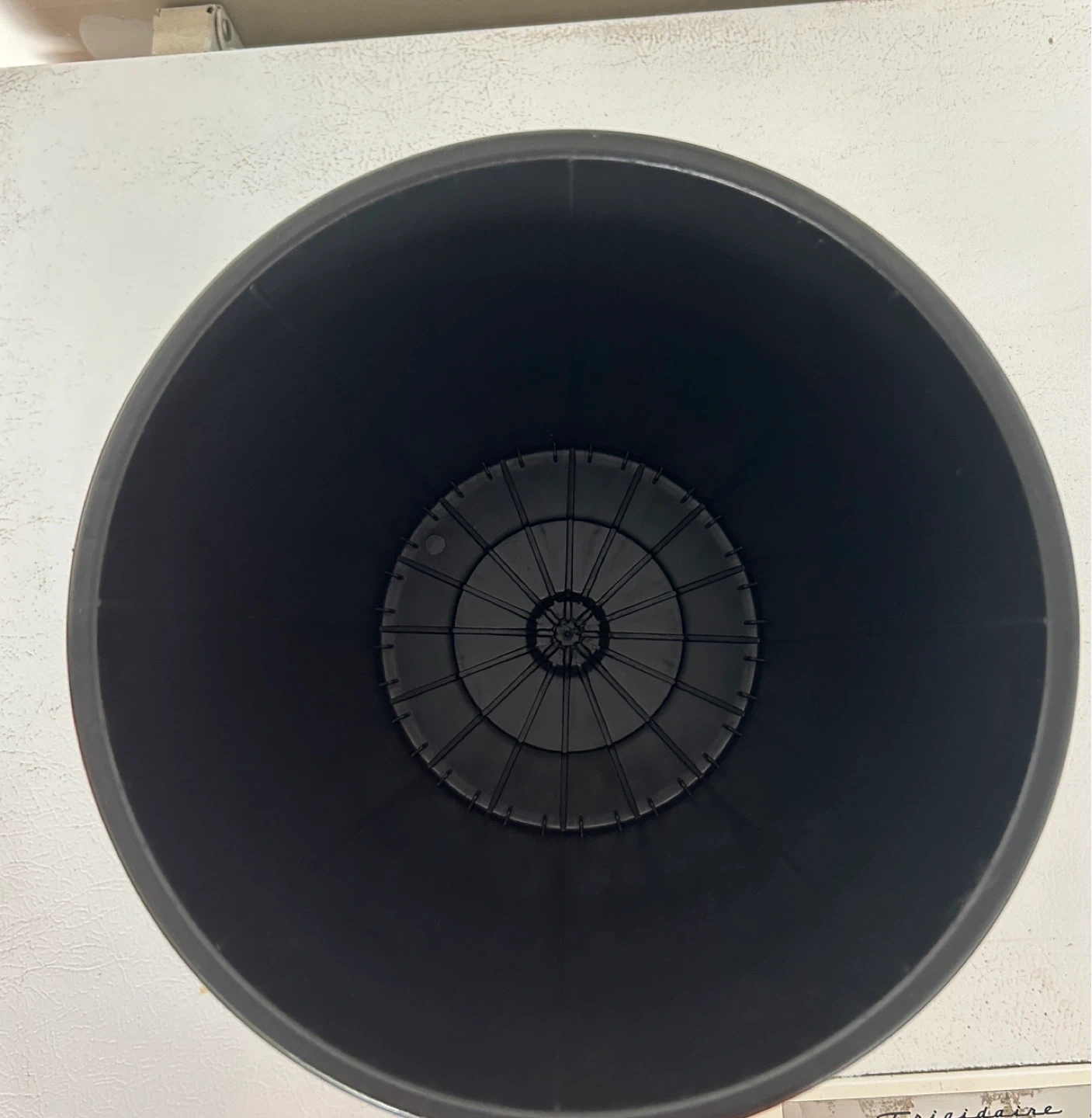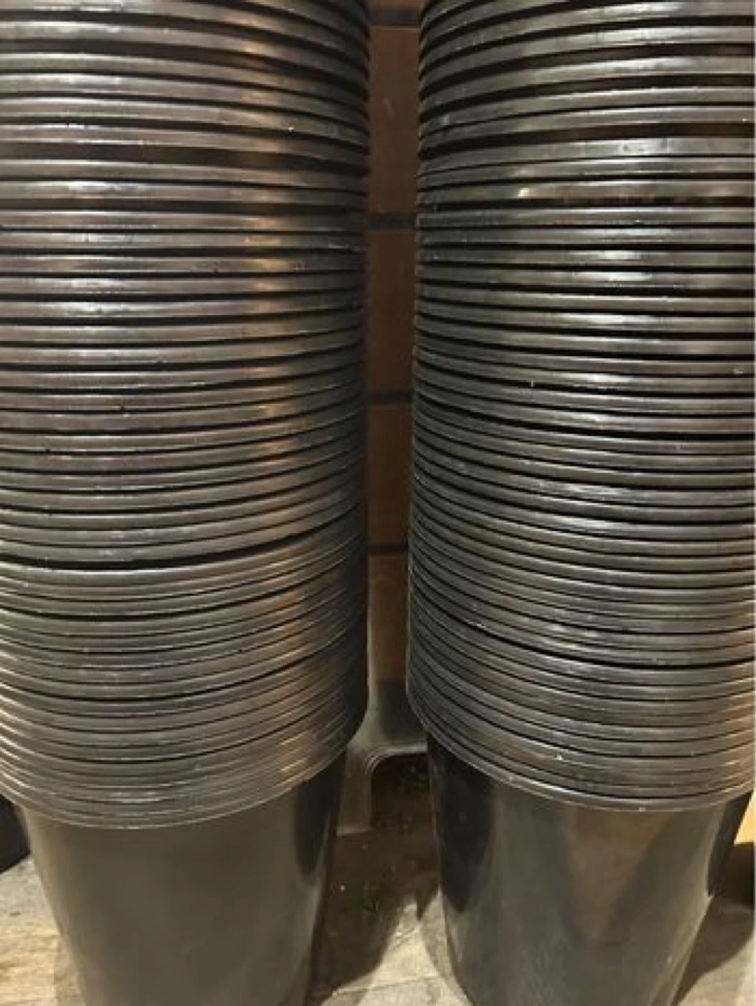 This is a set of black plastic planter pots. They are made of durable plastic. The pots have a diameter of approximately 10 inches and a height of 10"inches. These are great for starting seedlings planting,or for houseplants.