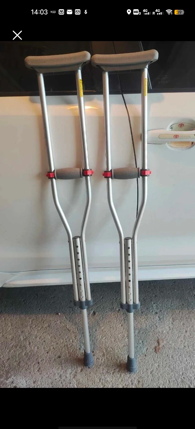 Selling a pair of adjustable aluminum crutches. They appear to be in good condition and are ready to help someone in need. They are adjustable to different heights for a comfortable fit.