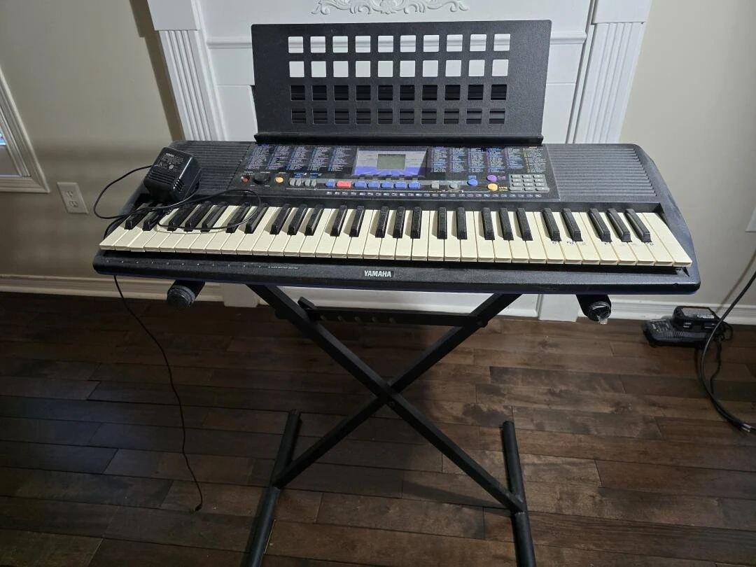 This is a Yamaha PSR-190 electronic keyboard. It includes a sturdy X-style stand. It's ready for music practice!