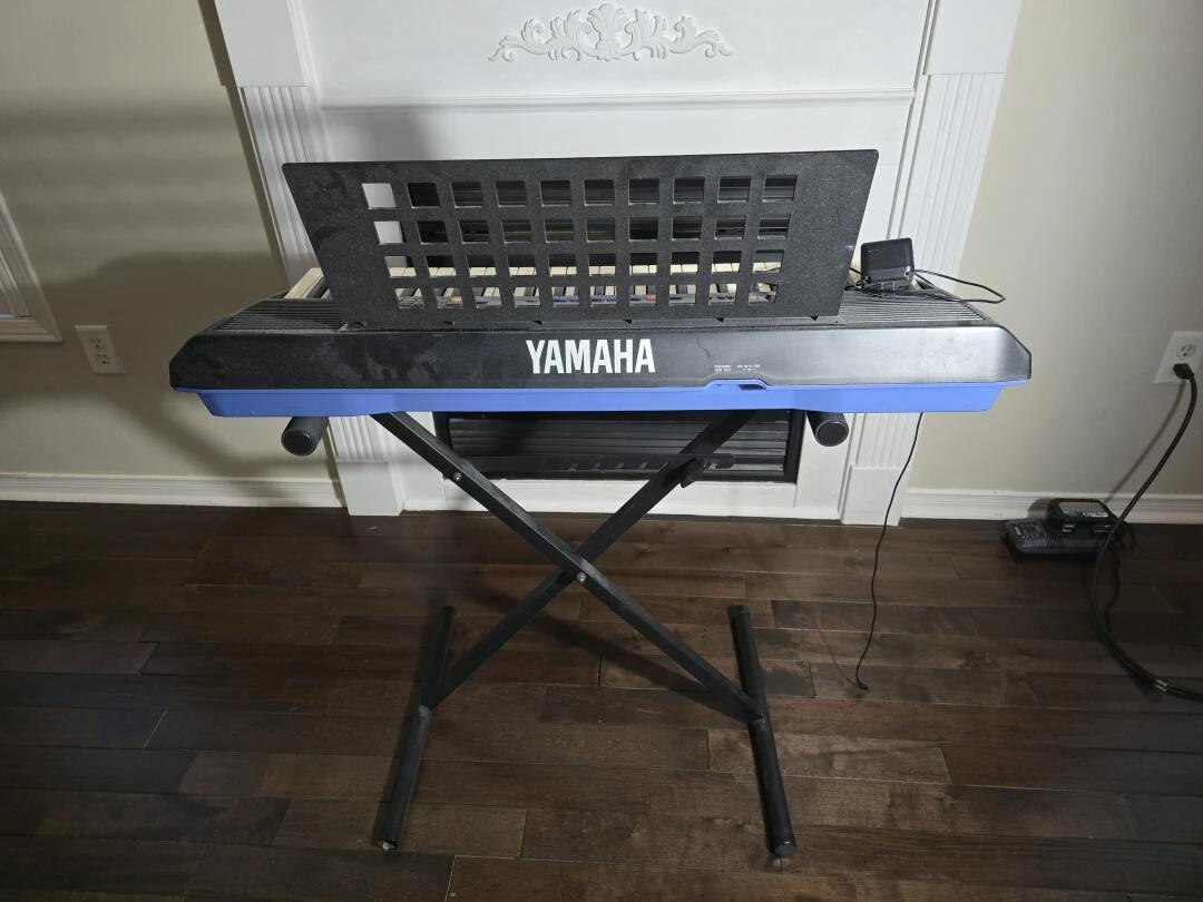 This is a Yamaha PSR-190 electronic keyboard. It includes a sturdy X-style stand. It's ready for music practice!