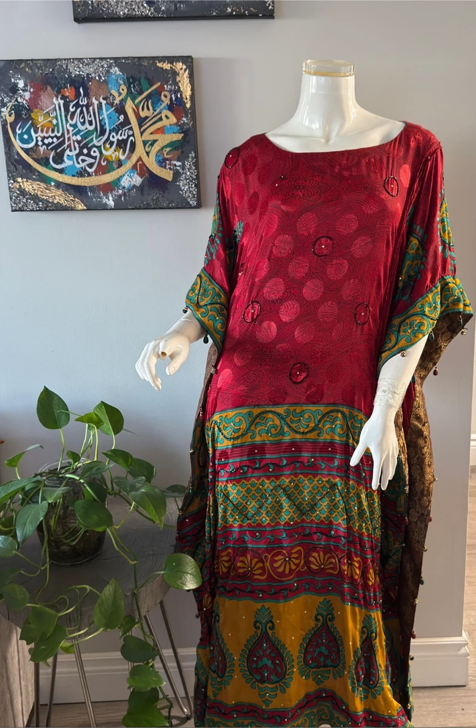 This vibrant kaftan features a flowing silhouette with a colourful, patterned design. It has a wide neckline and wide sleeves adorned with small beads. The materials silk lightweight. Medium to large size