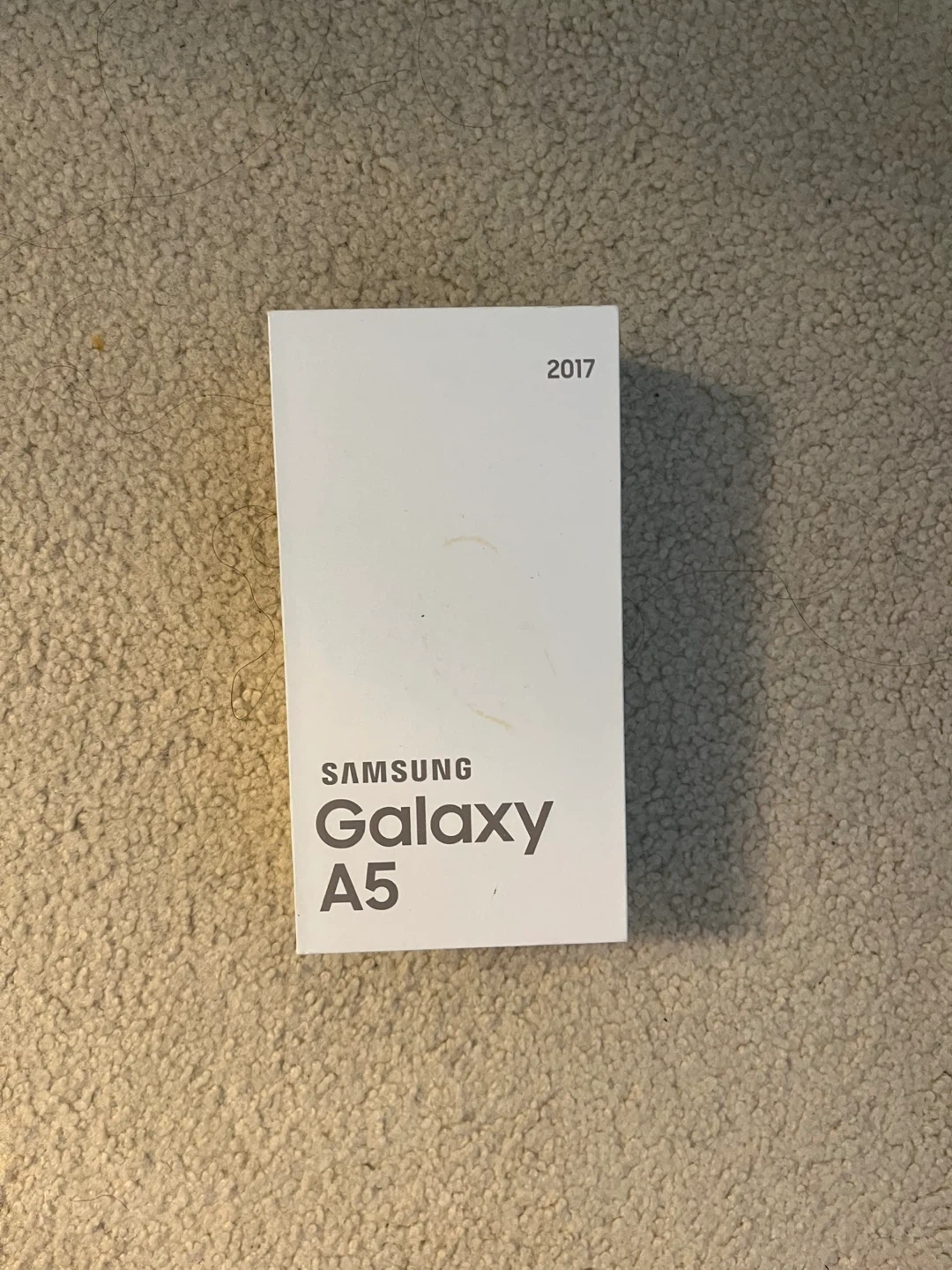 This is a Samsung Galaxy A5 smartphone. It's a black model. The original box is included. The back is cracked but the phone still works just like new