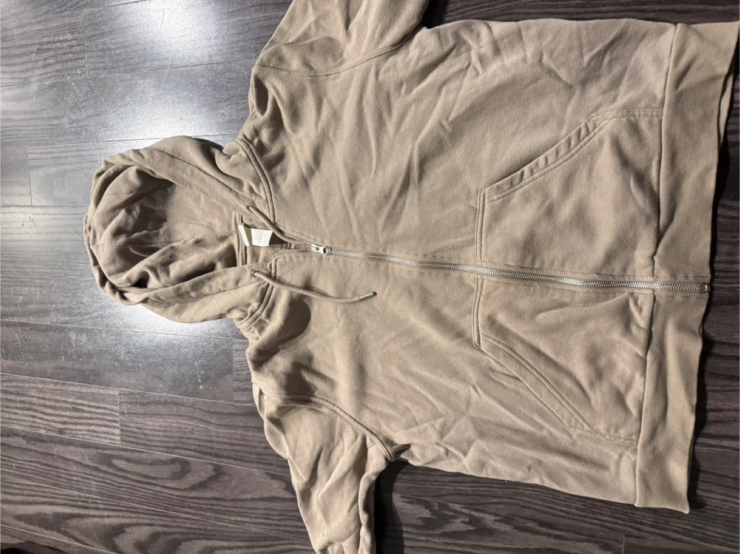 10Selling a beige zip-up hoodie from H&M Basics in size L. It's in great condition and ready for a new home!