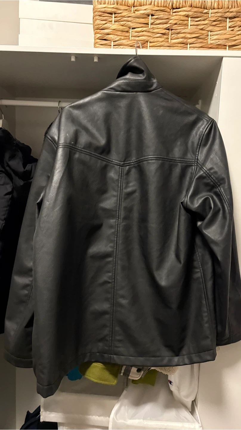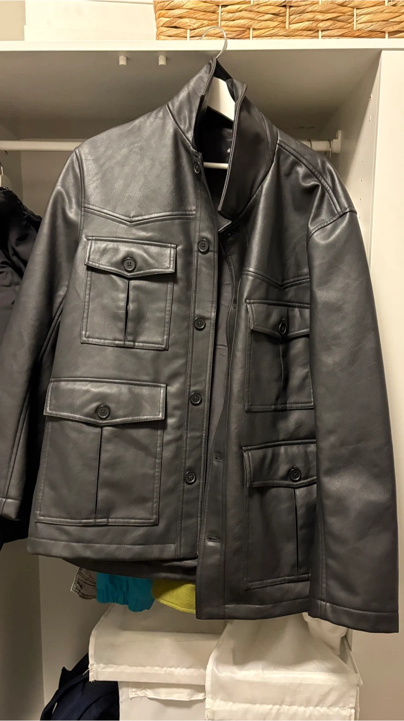 68Selling a stylish black faux leather jacket. It's in great shape and ready for a new home! The jacket features a unique design with multiple pockets and a sleek look. Perfect for adding a touch of edgy sophistication to your wardrobe It’s from an H&M and never used