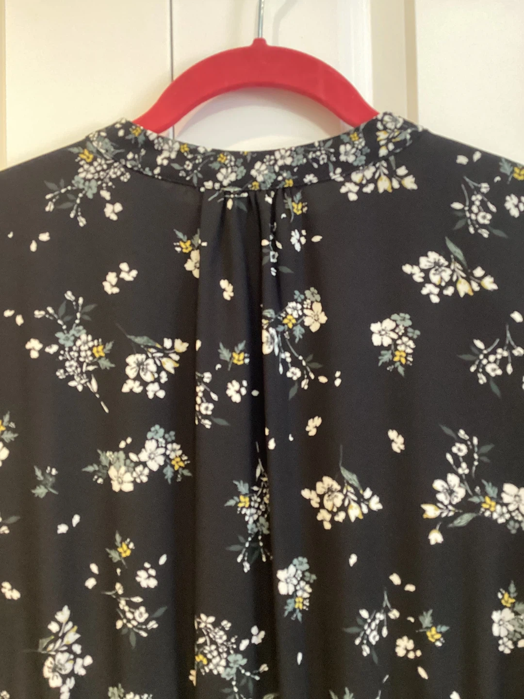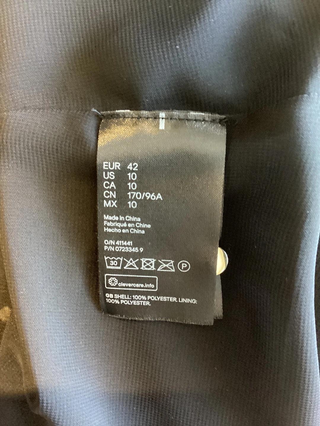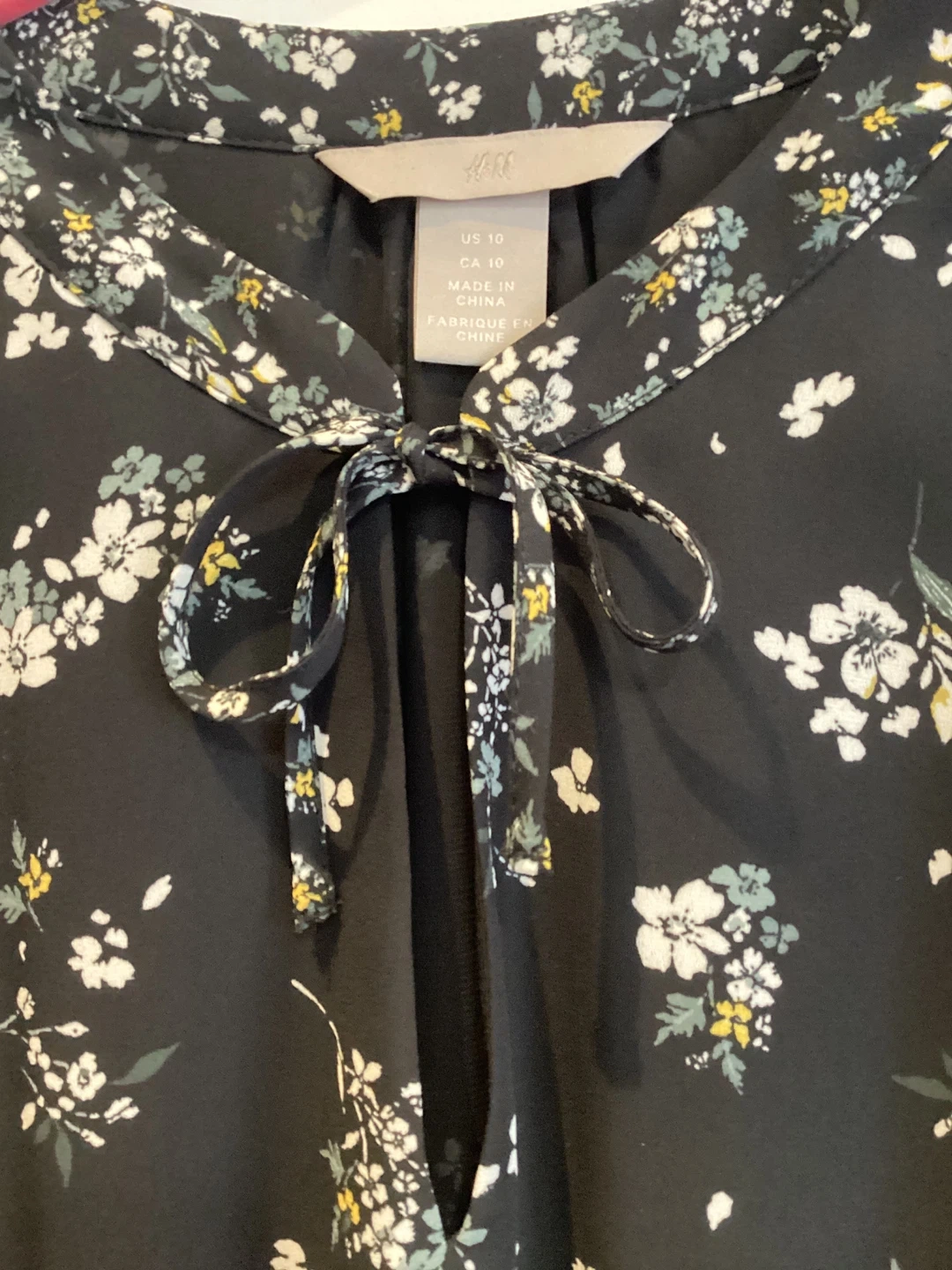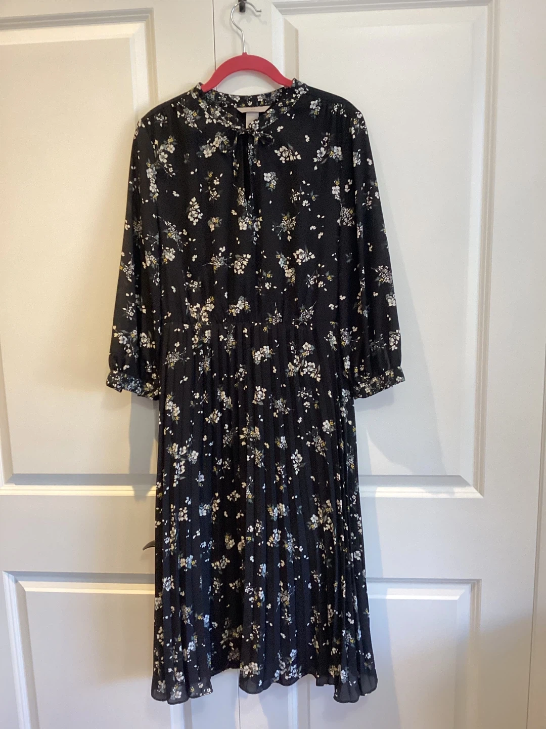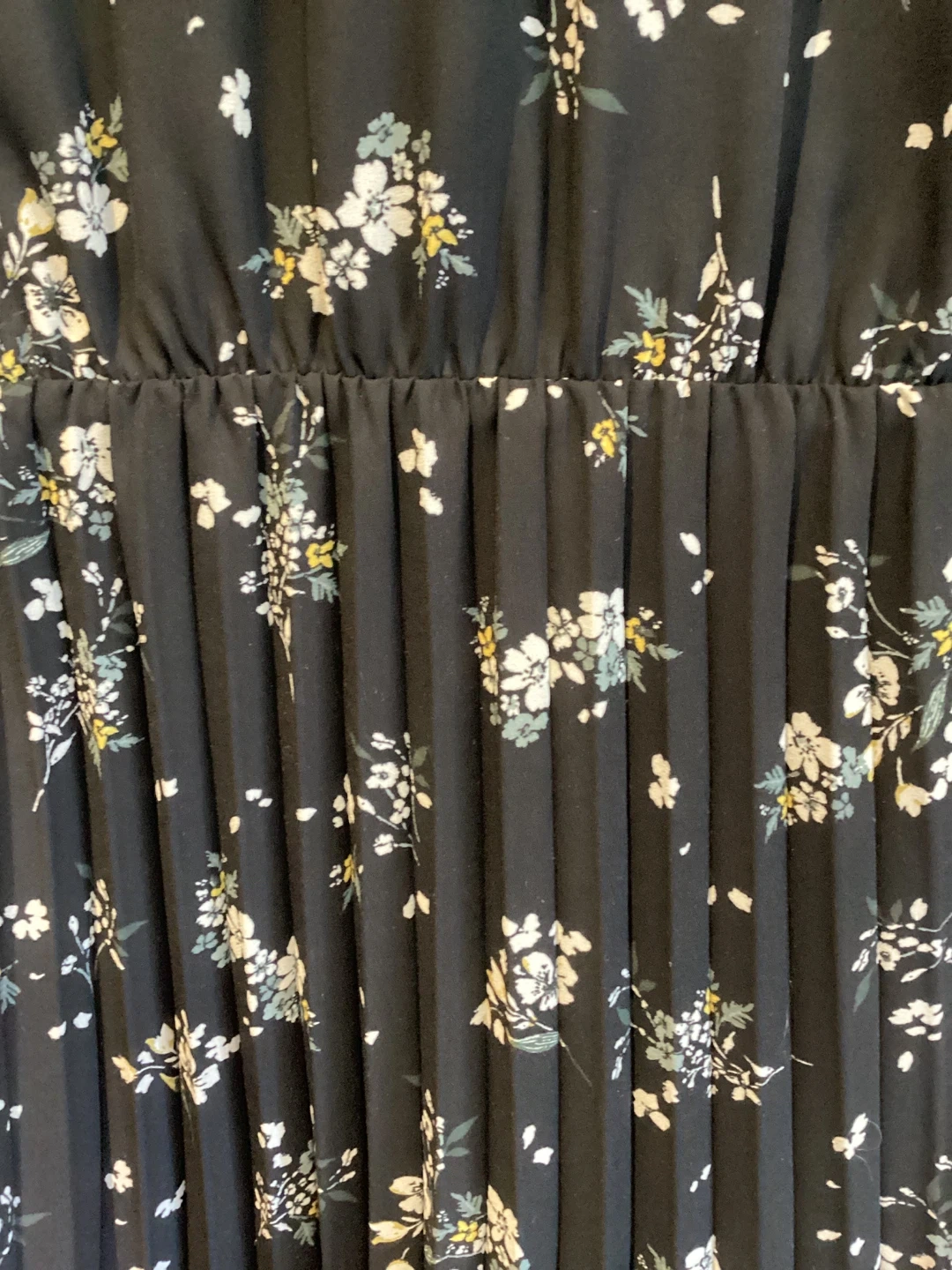 207H&M Black Floral Print Dress, midi length, like new, fully lined, pleated skirt, elastic waist, 100% Polyester, size 10, $25 or best offer. Chest 40 1/2” Waist 30” before stretching Centre back length 44”