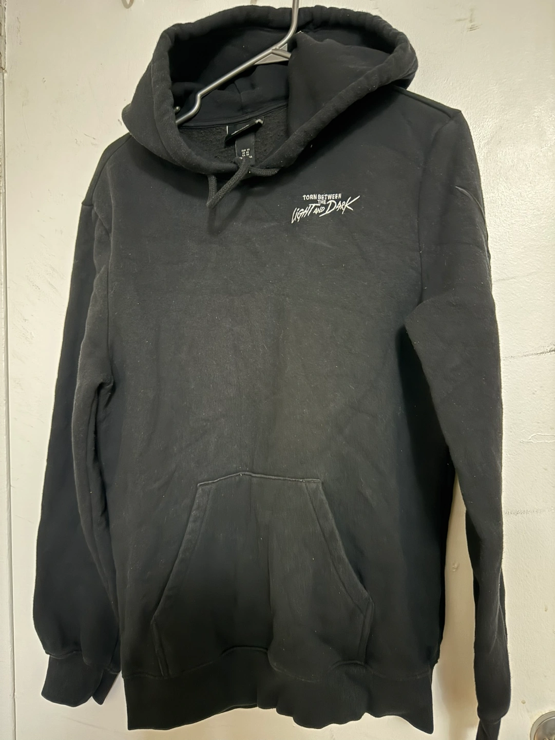 H&M Black hoodie with a graphic design. Size XS. Regular fit. Shows some wear. Used twice. Good condition