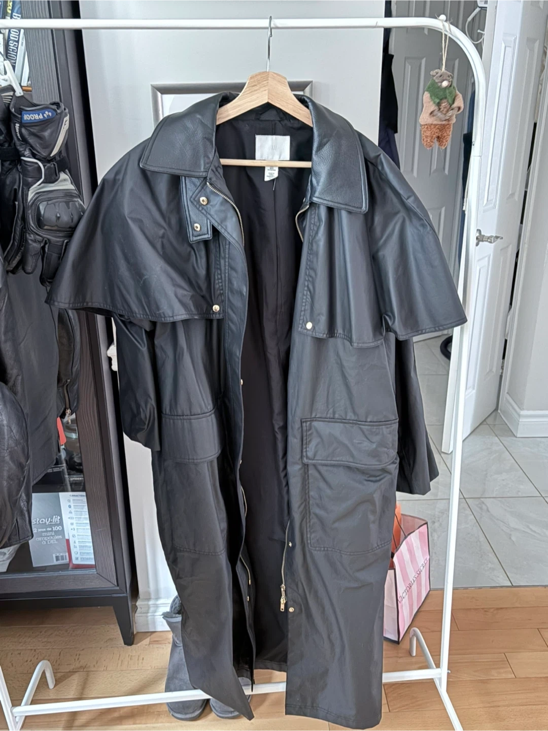 60Selling a stylish black trench coat from H&M, size L. It's in great condition and works well for slightly cold rainy days. Made from coaxed cotton, rainproof. A versatile addition to any wardrobe!