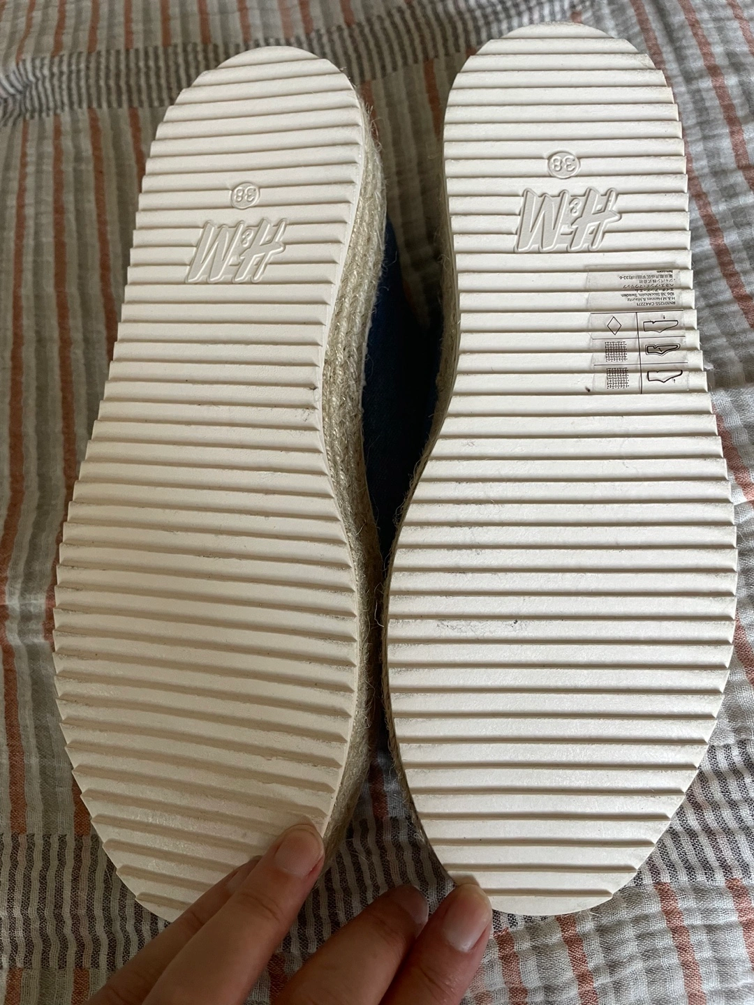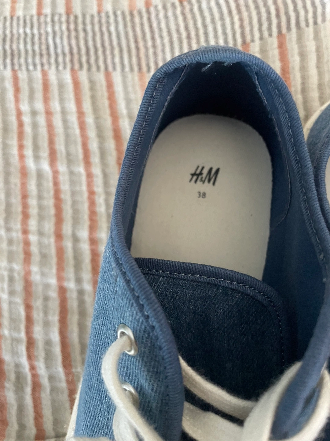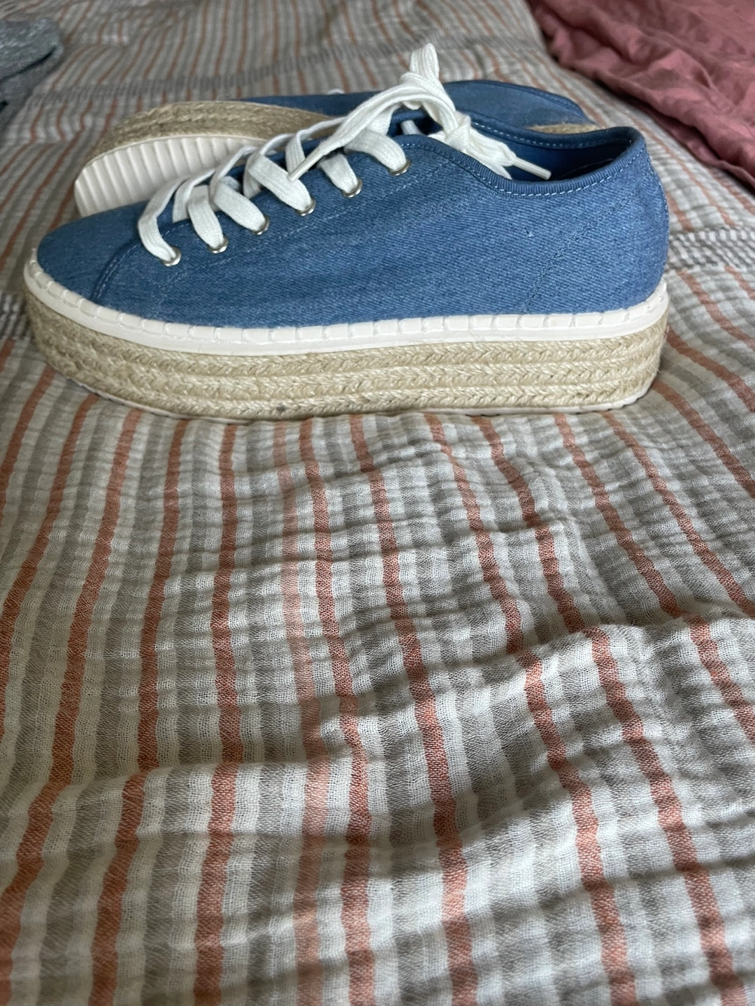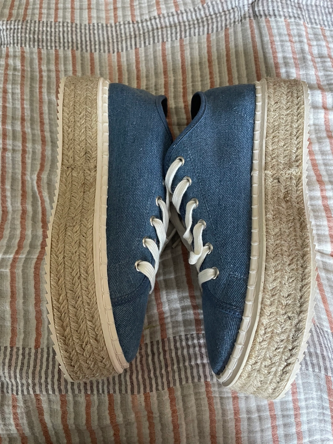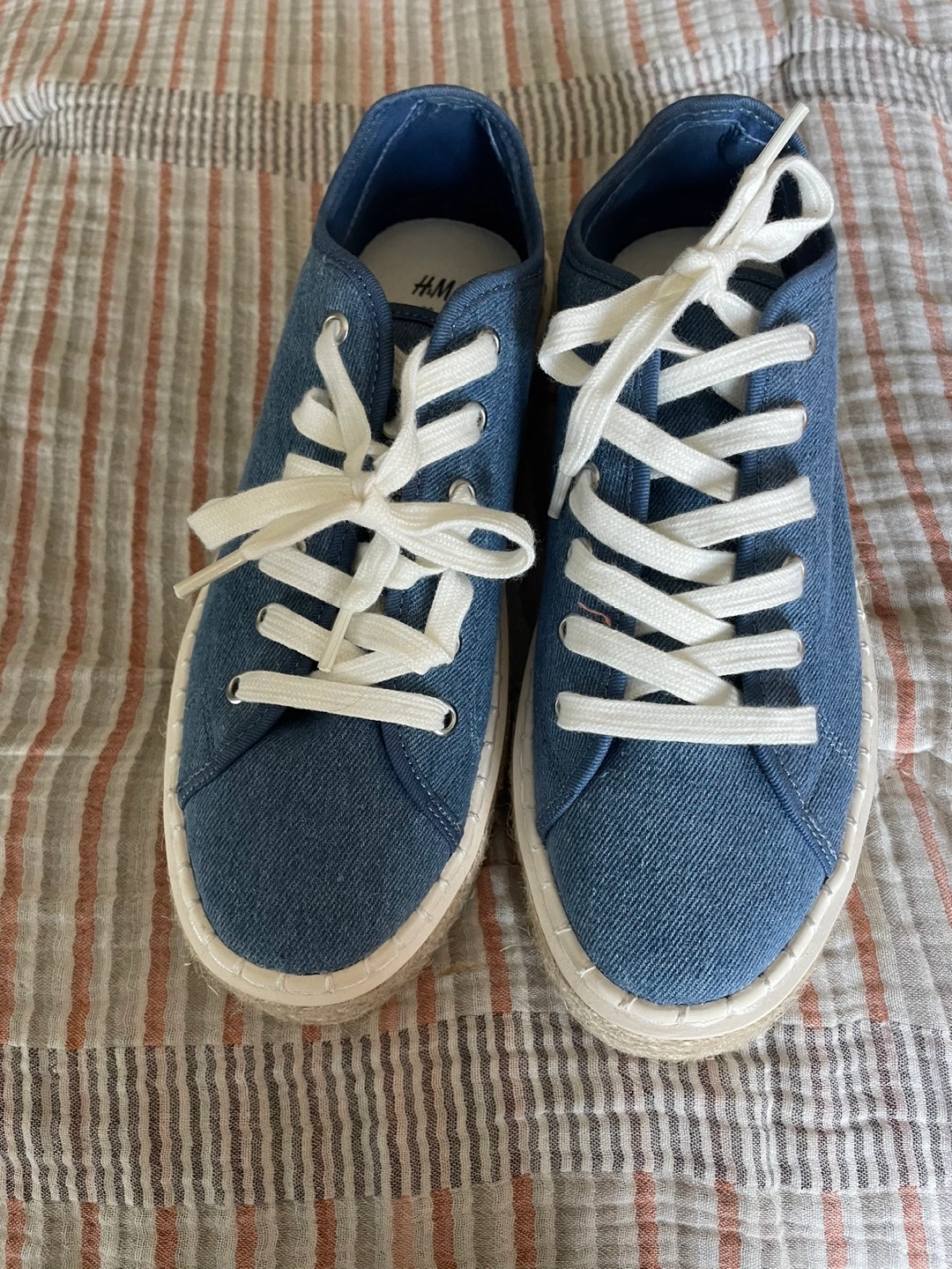 Selling a pair of H&M blue espadrille sneakers in size 38. They're in great condition and perfect for adding a bit of height with the platform sole. The denim-like material gives them a casual vibe. They have white laces and a jute-wrapped platform!