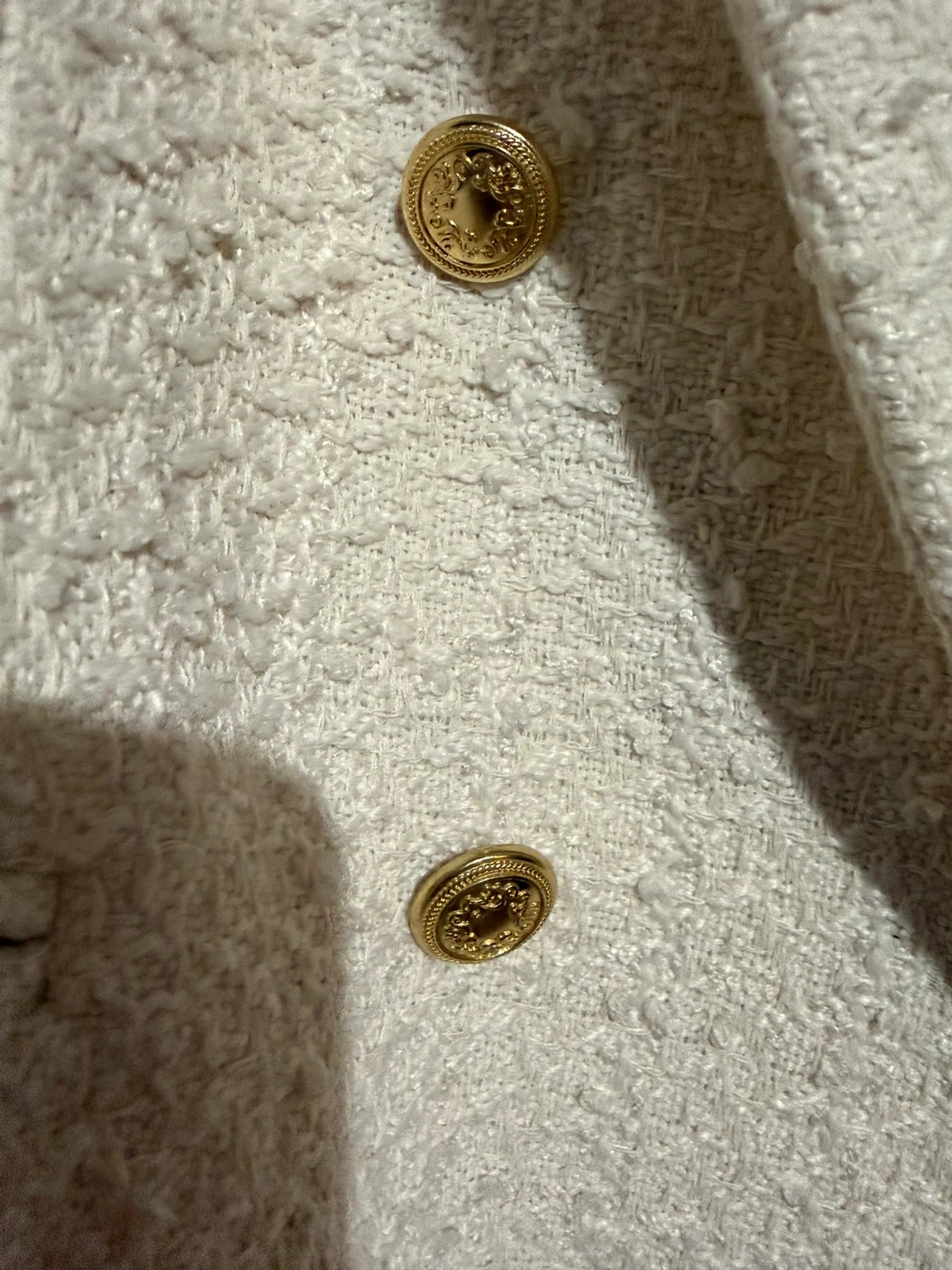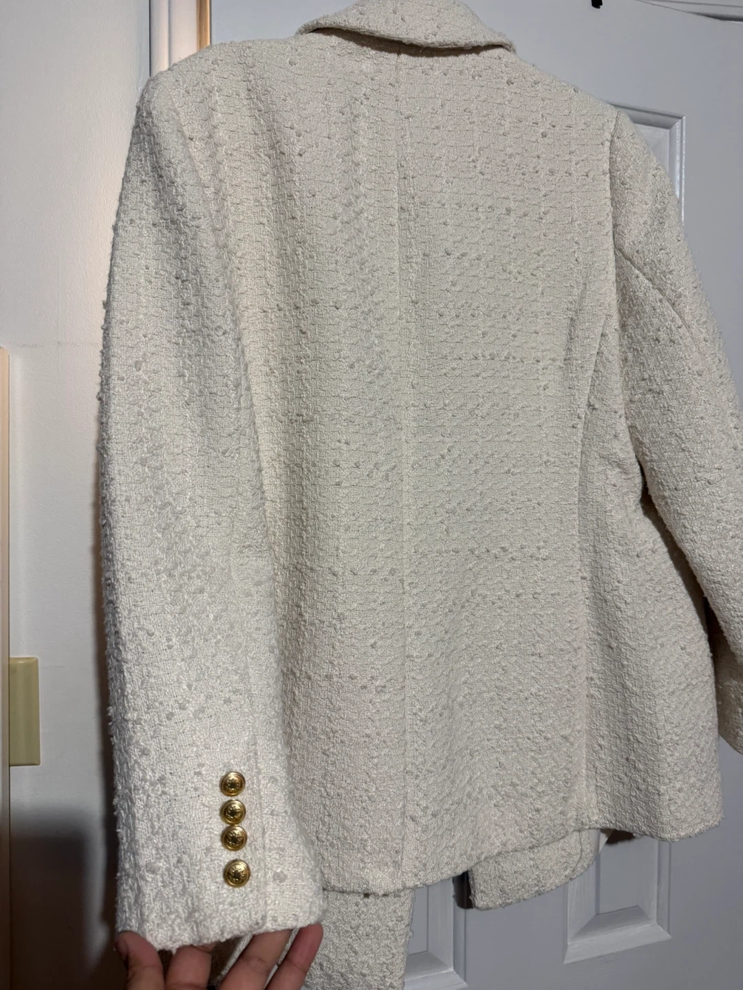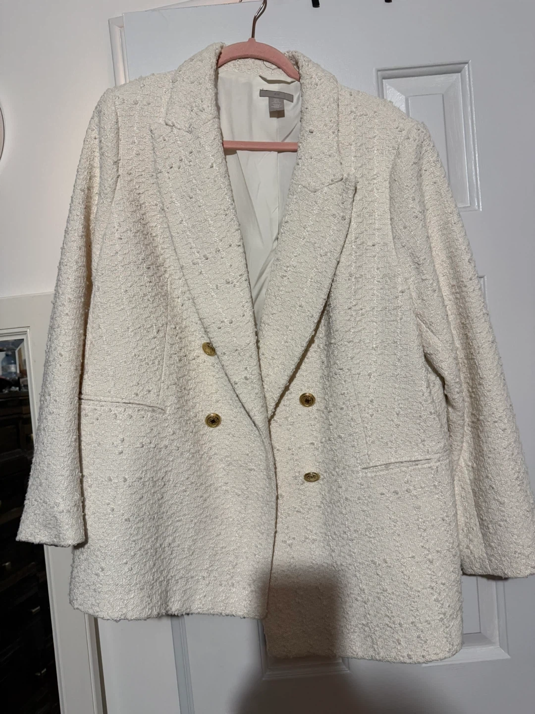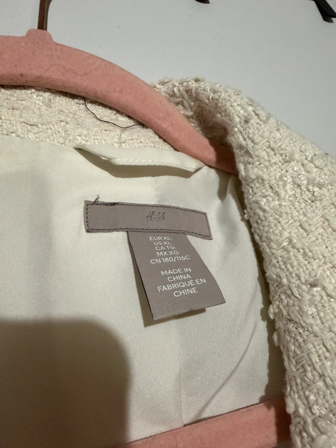 68Selling a stylish H&M blazer in a cream tweed fabric! It's a size XL and features gold-toned buttons. Perfect for adding a touch of sophistication to any outfit. New without tag.