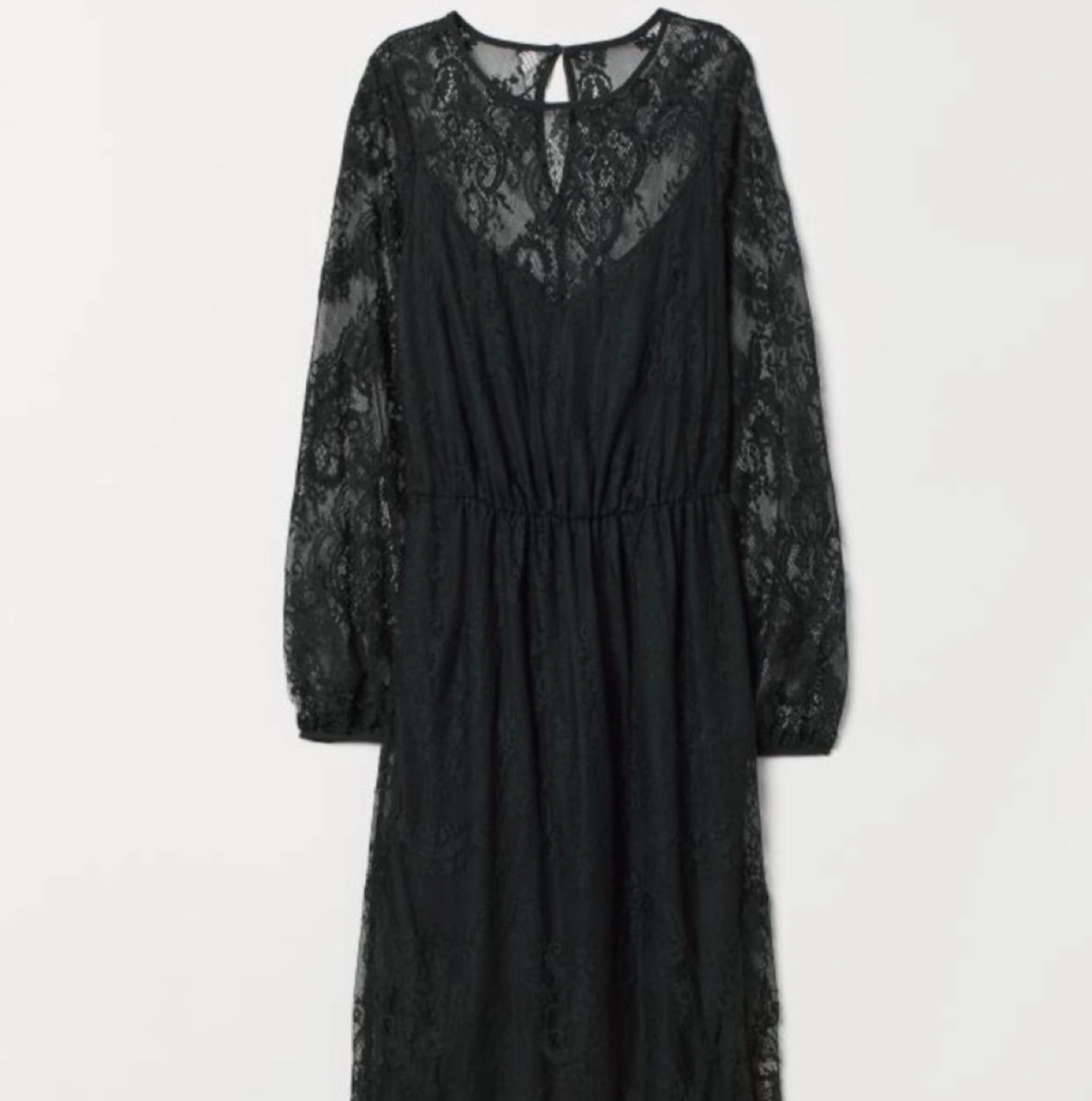 1000+Elegant dark green lace midi dress. Long sleeves, fitted bodice, and flowy skirt. Open back detail. Size 0.