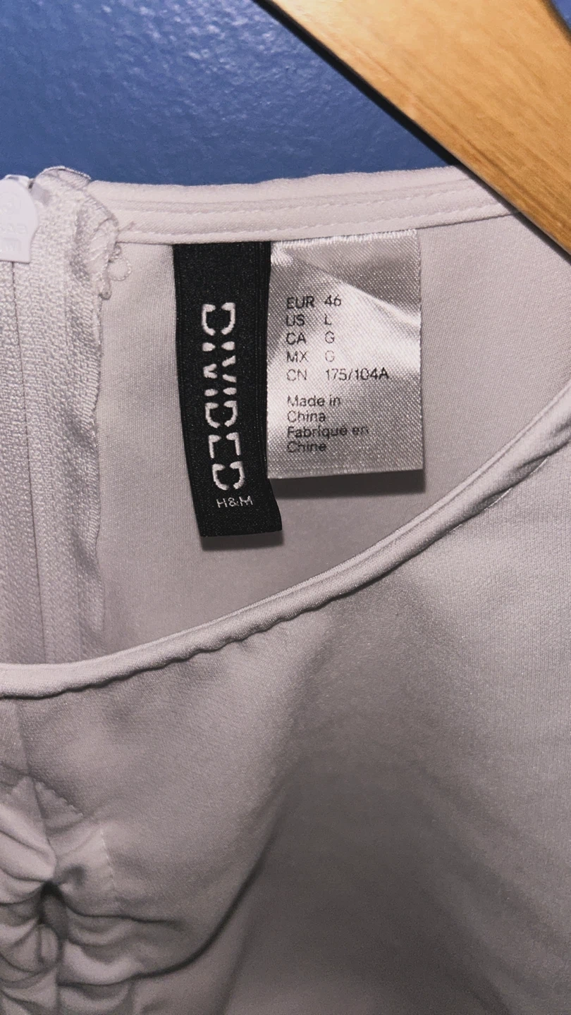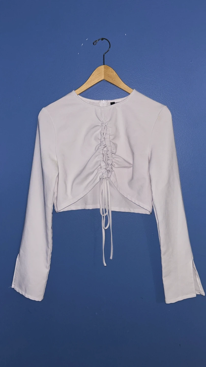 15Selling a cute white long sleeve top from H&M's Divided line. It's a size large and in great condition! The top features a stylish cinched front with adjustable ties and a zipper in the back.
