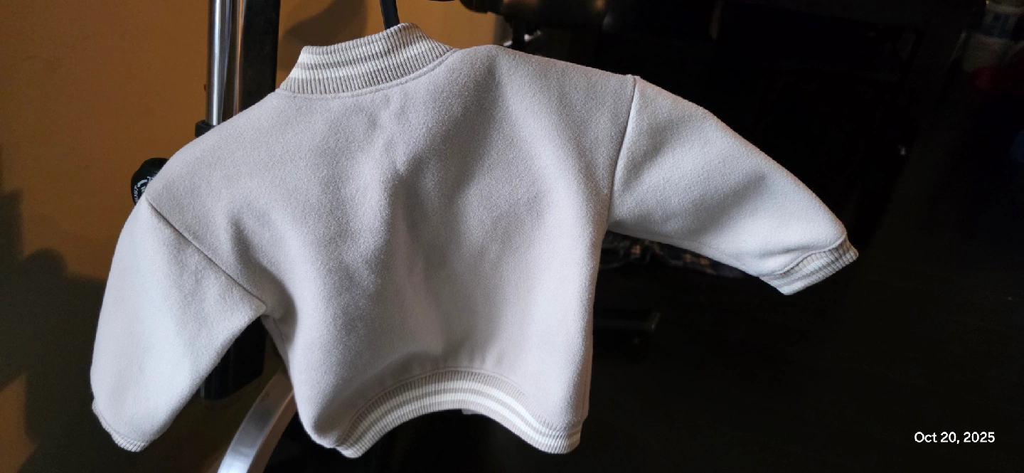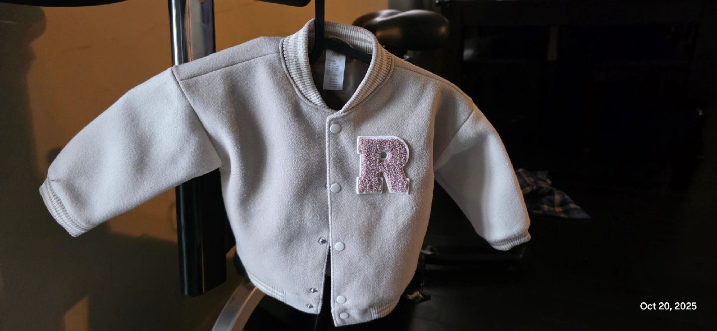 Here's a super cute letterman jacket from H&M Kids! It's in great condition and perfect for your little one. The jacket features a stylish design with a letter "R" on the front. It's sized for kids aged 2-4 years.