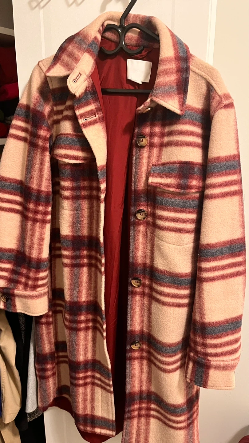 60Here's a cozy H&M plaid shacket in size small! It features a button-up front and a stylish plaid pattern in cream, red, and blue. Perfect for layering during the cooler months! Pick up in South Granville