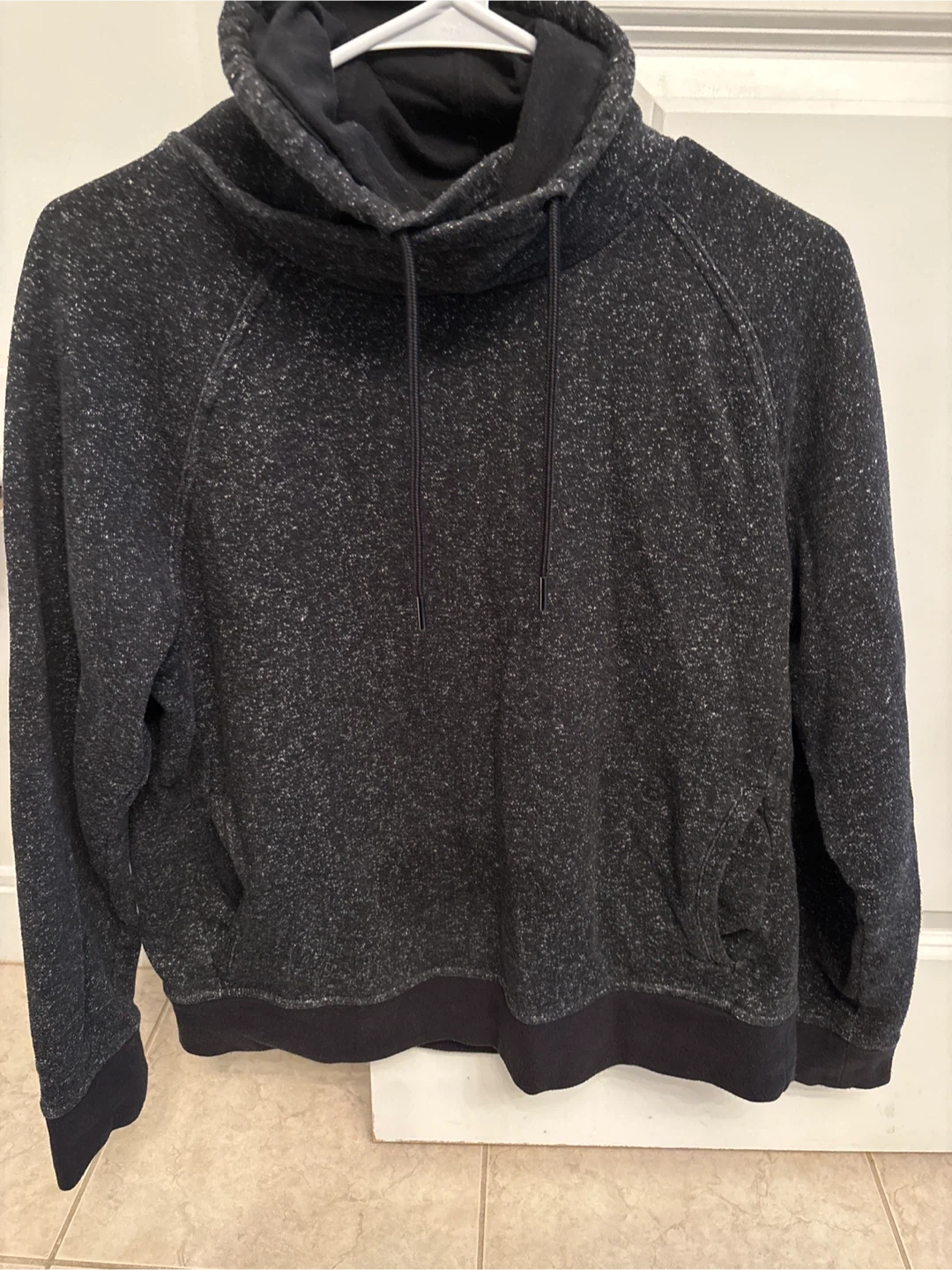 152Selling used H&M funnel neck pullover. Fits small/medium and features a unique black and grey marled pattern.