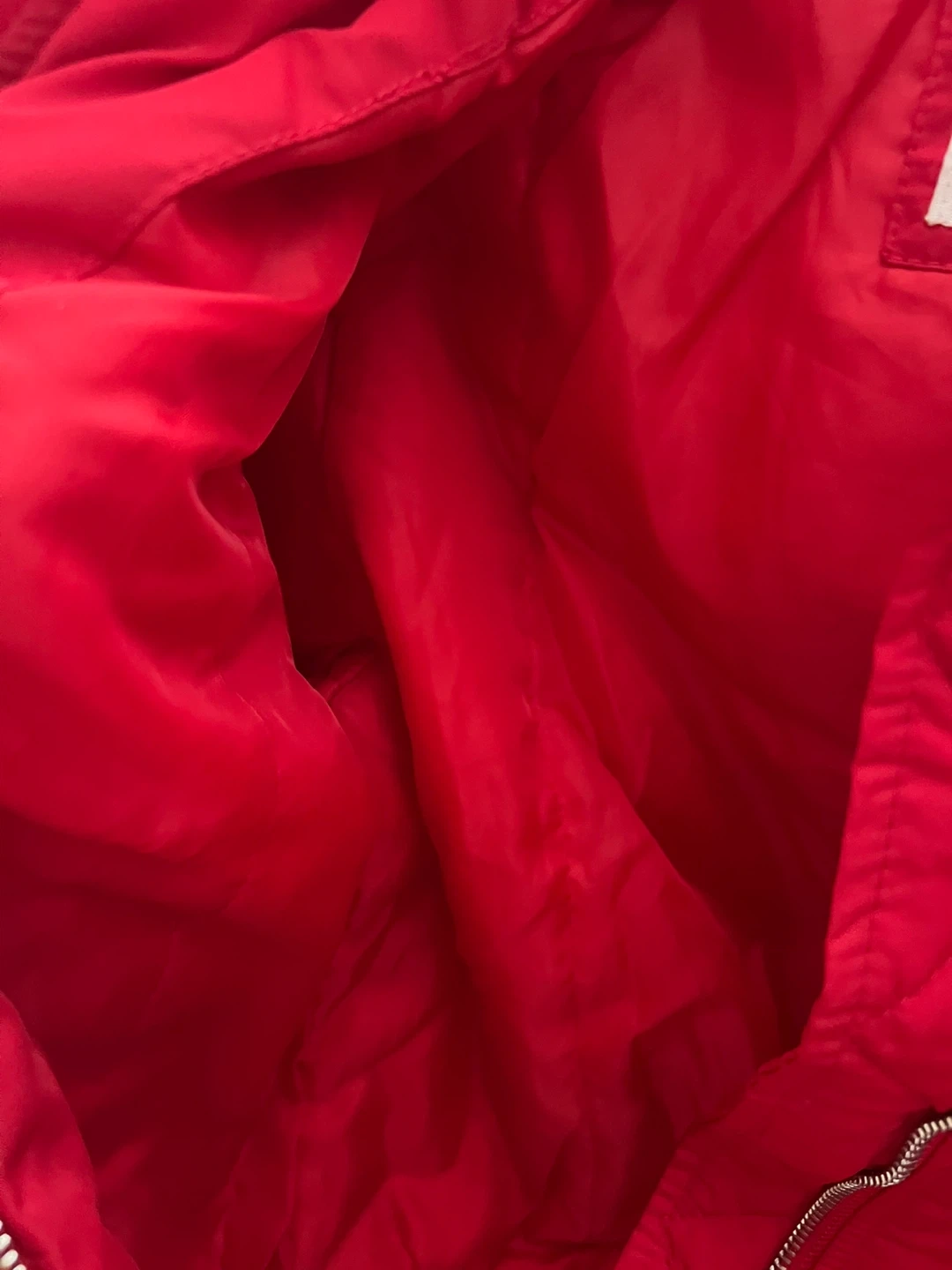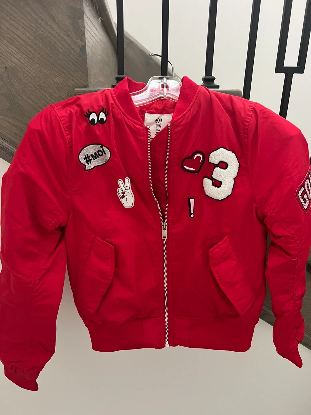 83Cute red bomber jacket from H&M! It's a size 9-10Y (EUR 140, US 9-10T, CA 9-10A). The jacket has fun patches and a smooth zipper