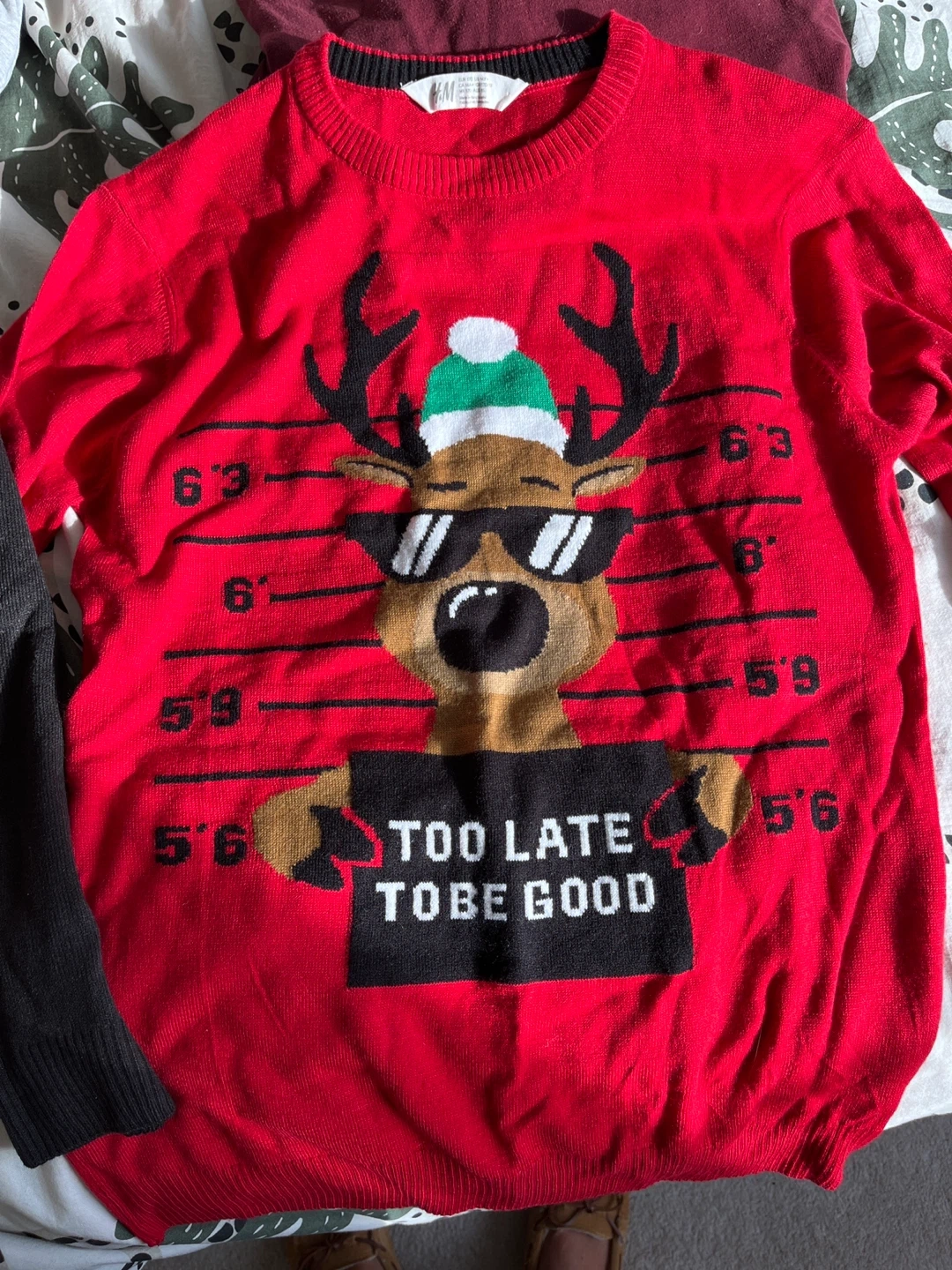 45Selling a fun red Christmas sweater from H&M! It features a reindeer wearing sunglasses and a hat, with the saying 'TOO LATE TO BE GOOD' on it. Perfect for the holidays! Kids size 14+ or fits women’s xs.