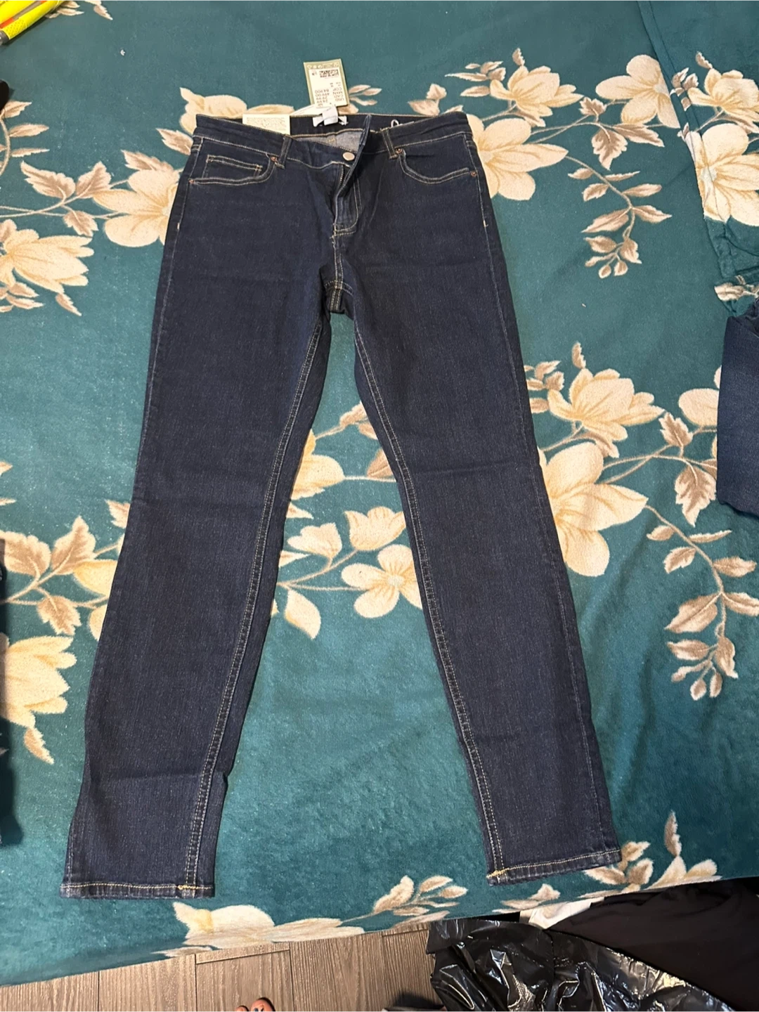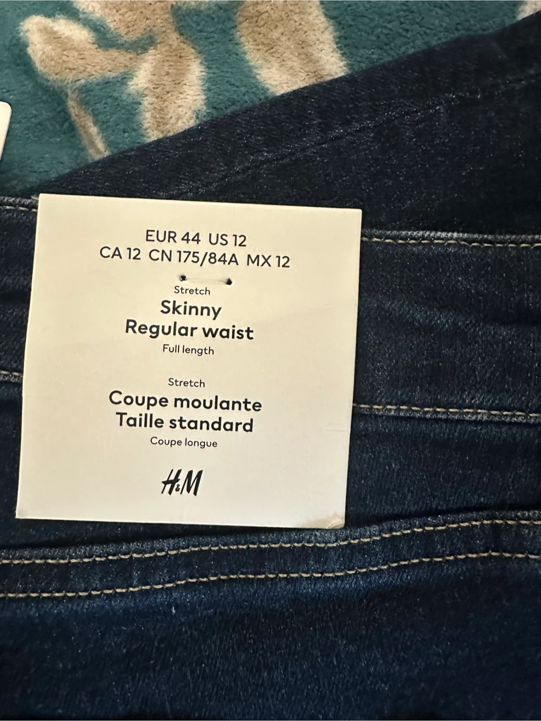 102Selling a pair of H&M skinny jeans in size US 12. They have a regular waist and a full length. These are a stretch material for a comfortable fit!