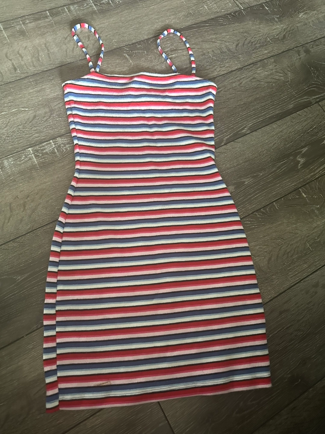 This chic bodycon mini dress from H&M features a striking red and white color palette, perfect for a casual night out. The sleeveless design with spaghetti straps offers a modern and flattering silhouette. Its vibrant colors and sleek style make it a standout piece for any wardrobe. Size 4/Xs