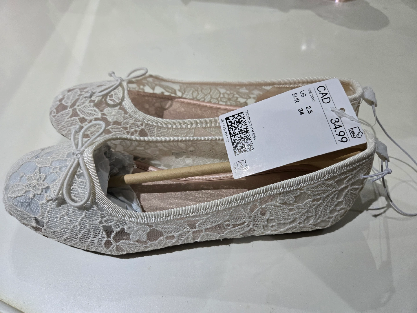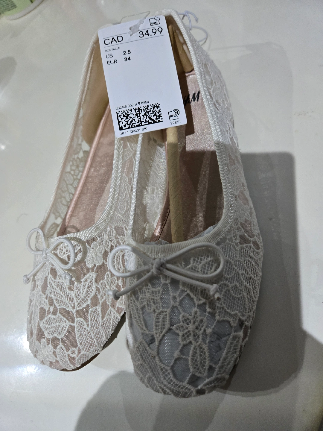 10These adorable H&M ballet flats are perfect for any little one! They feature a delicate white lace design and a sweet bow detail. The size is US 2.5 / EUR 34. They're in great condition and ready for a new home! Originally bought for $34.99 CAD