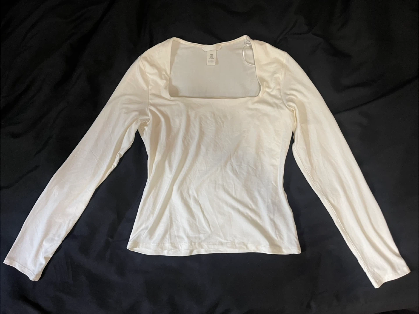 84Selling a white long sleeve top from H&M! It's a size medium and has a square neckline. Perfect for layering or wearing on its own!