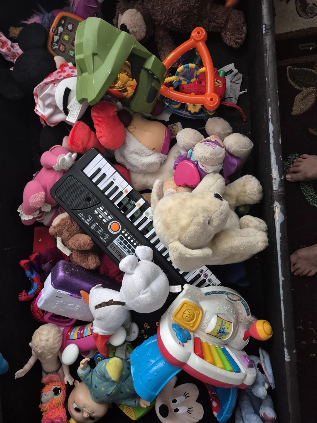 A bundle of kids' toys including a black electronic keyboard and several plush stuffed animals. The keyboard has multiple keys and buttons. It's great for musical fun! Lots of cuddly friends included too.