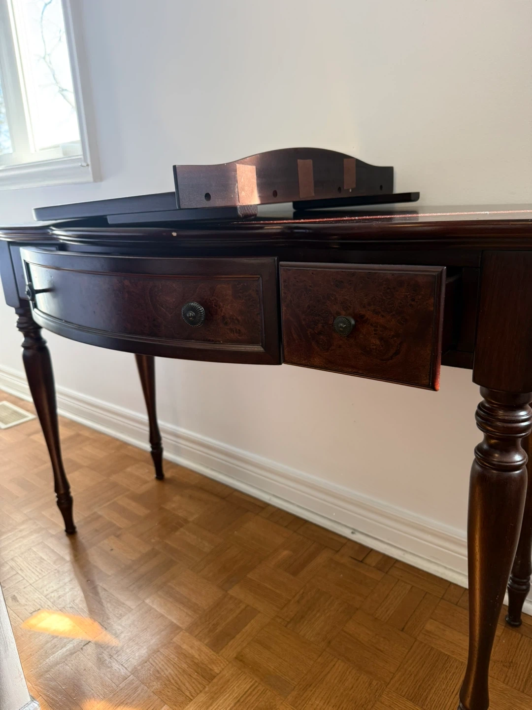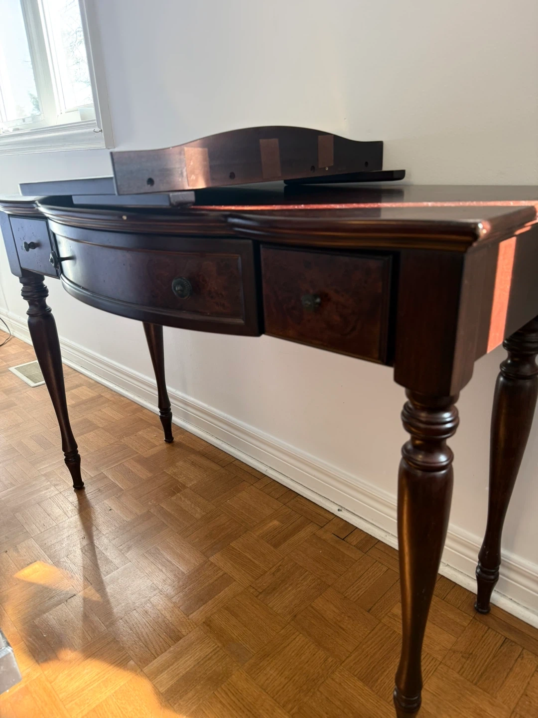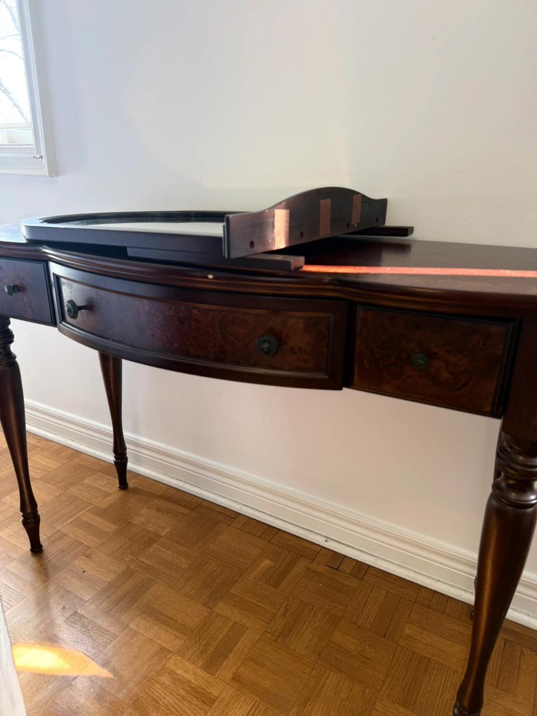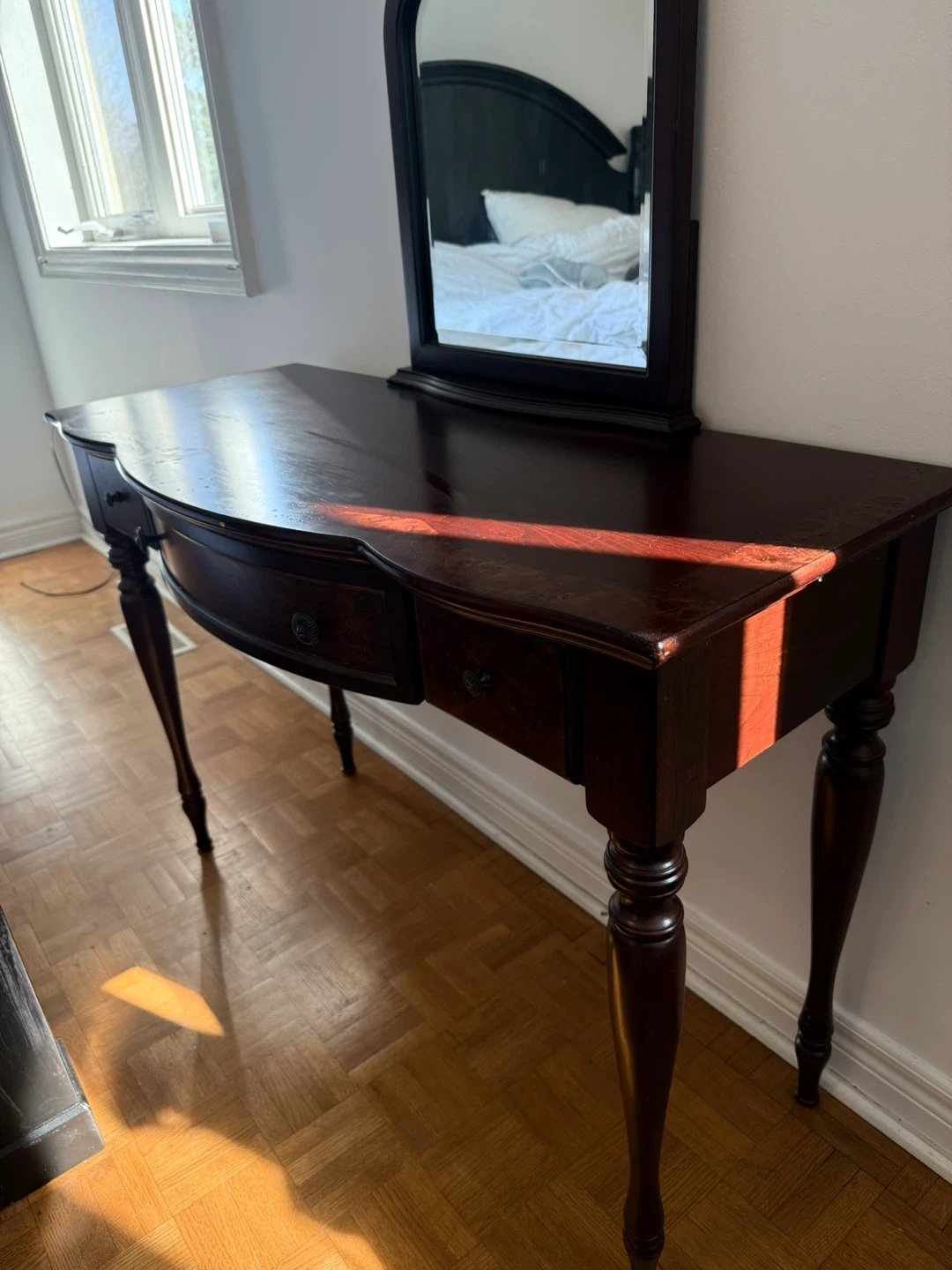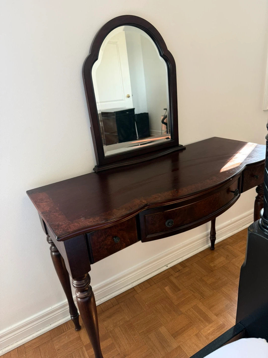 Beautiful dark wood console table with a curved front and three drawers. It comes with a matching arched mirror, perfect for a bedroom or entryway. The table's legs are elegantly turned. Wood material.