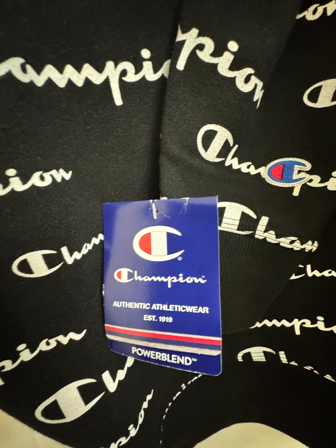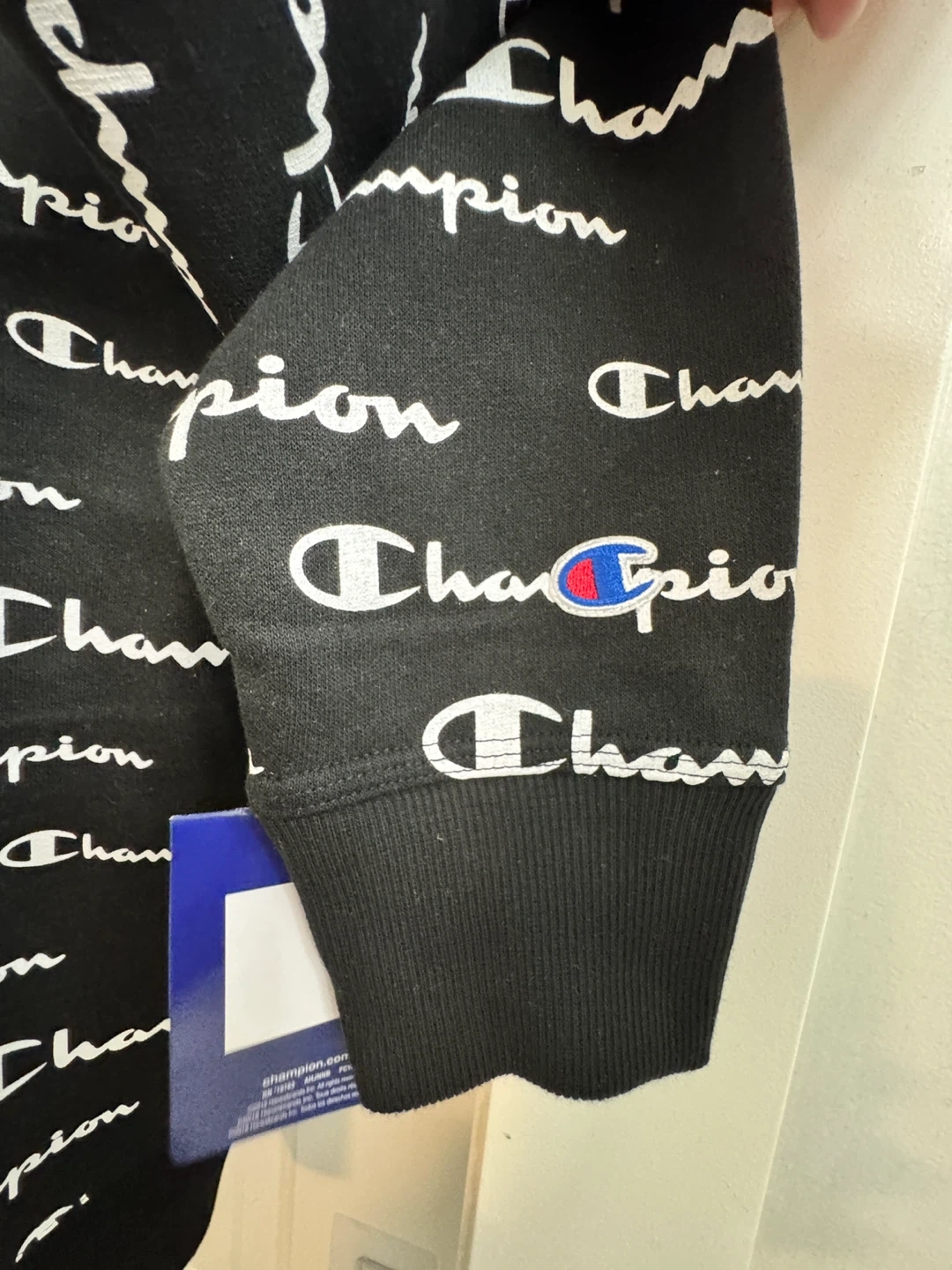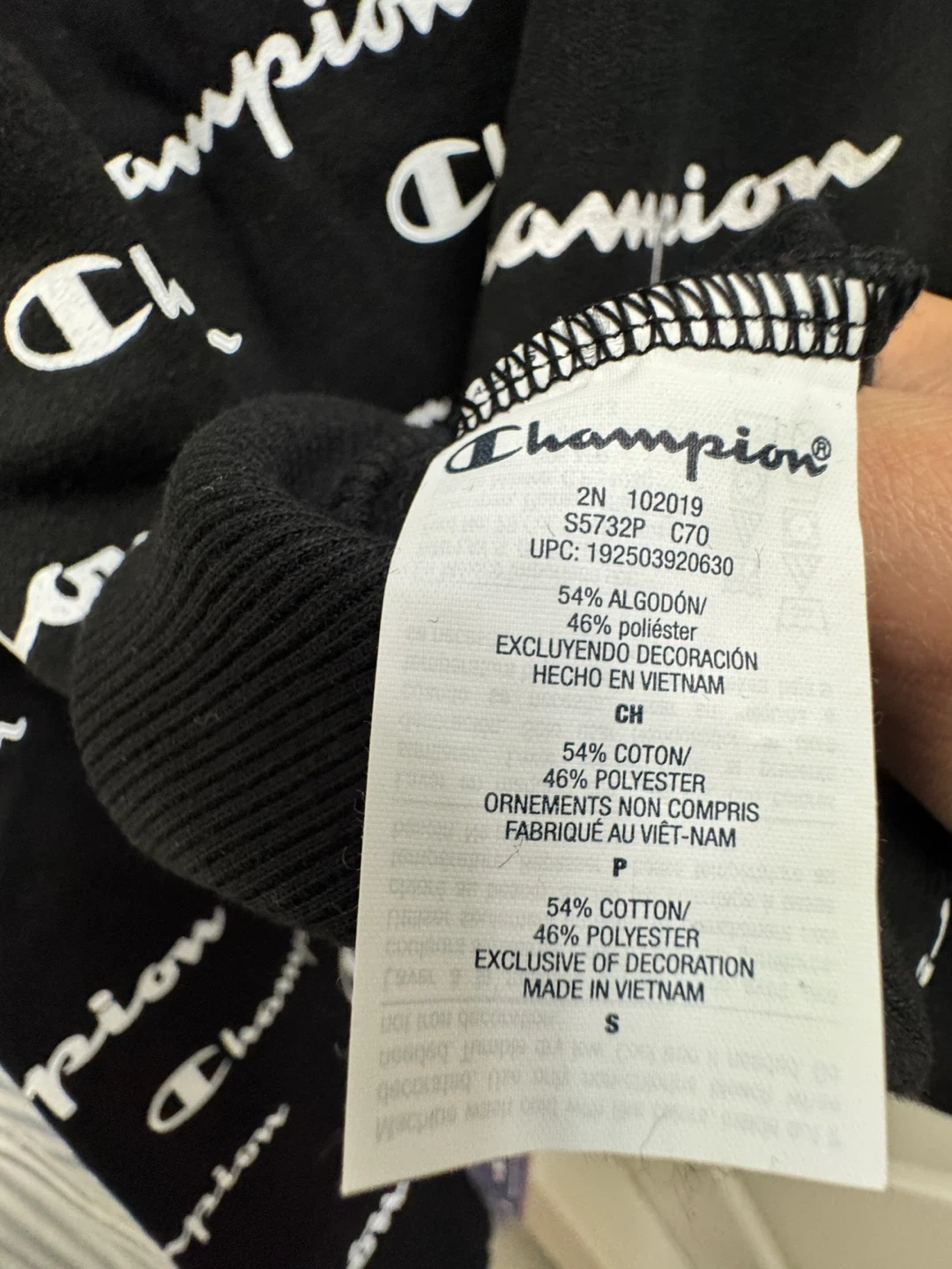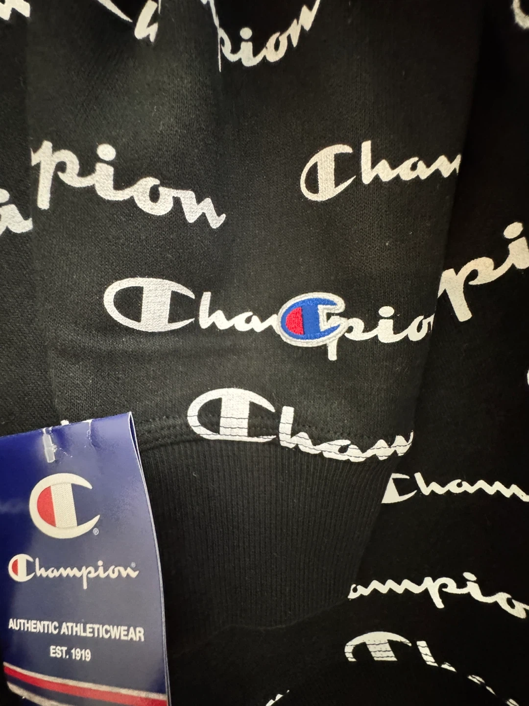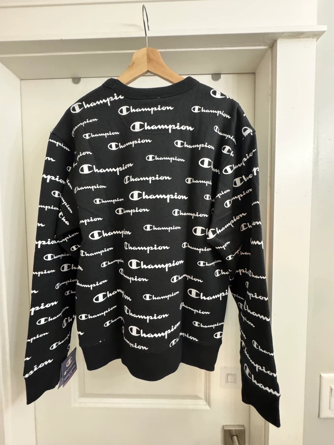 Selling a Champion crewneck sweatshirt with an all-over print! It's black and white and in great condition. The size is S.