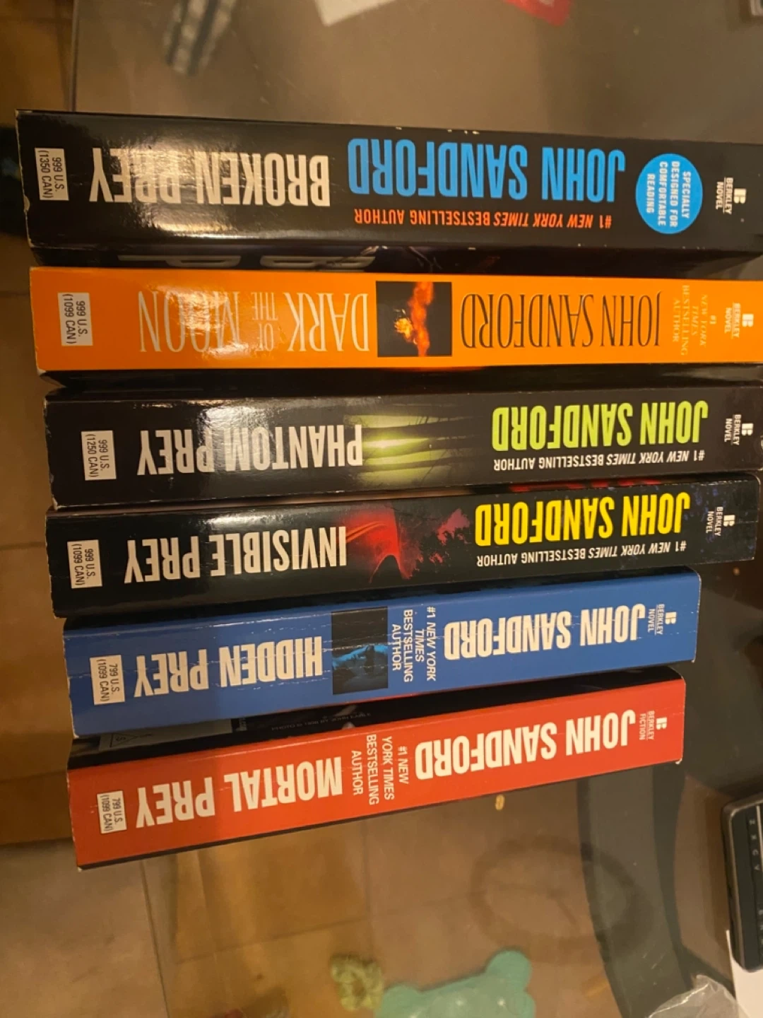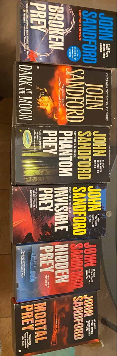 Seven books from #1 New York Times best selling author John Sandford's including the Prey series. Titles include Dead Watch, Mortal Prey, Hidden Prey, Invisible Prey, Phantom Prey, Dark the Moon, and Broken Prey. #1 New York Times bestselling author.