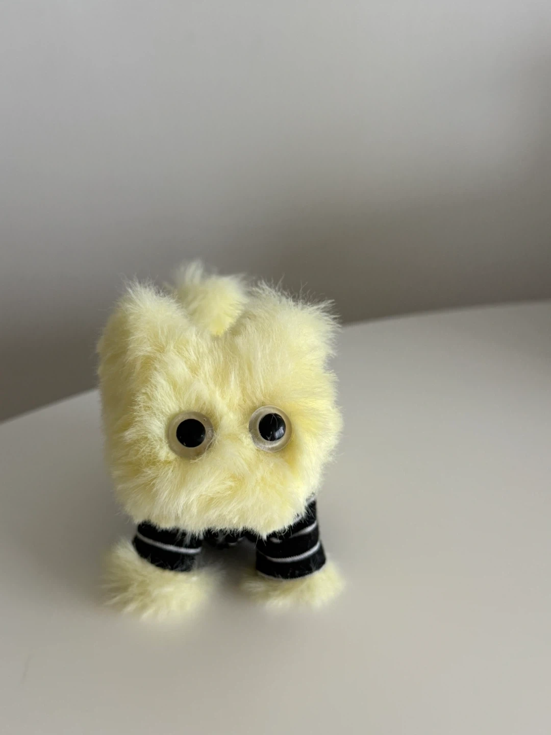 Hi there! I'm selling this super cute yellow Moru doll keyring. It’s a handmade item with a very soft, fluffy texture. I made it myself and this is the only one in Toronto! It's very special✨It features big, lovely eyes and is wearing a stylish black striped shirt.