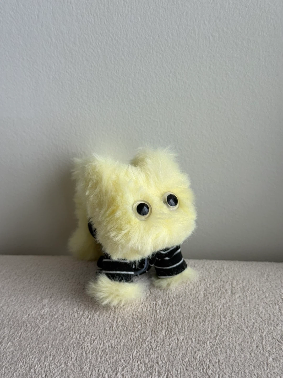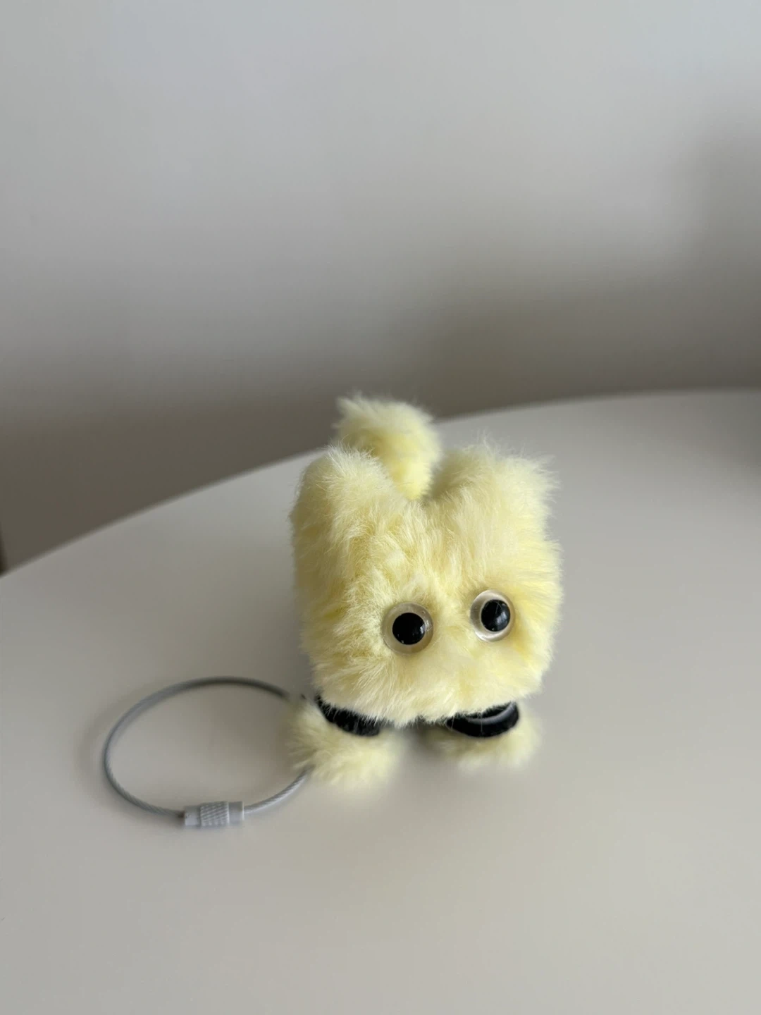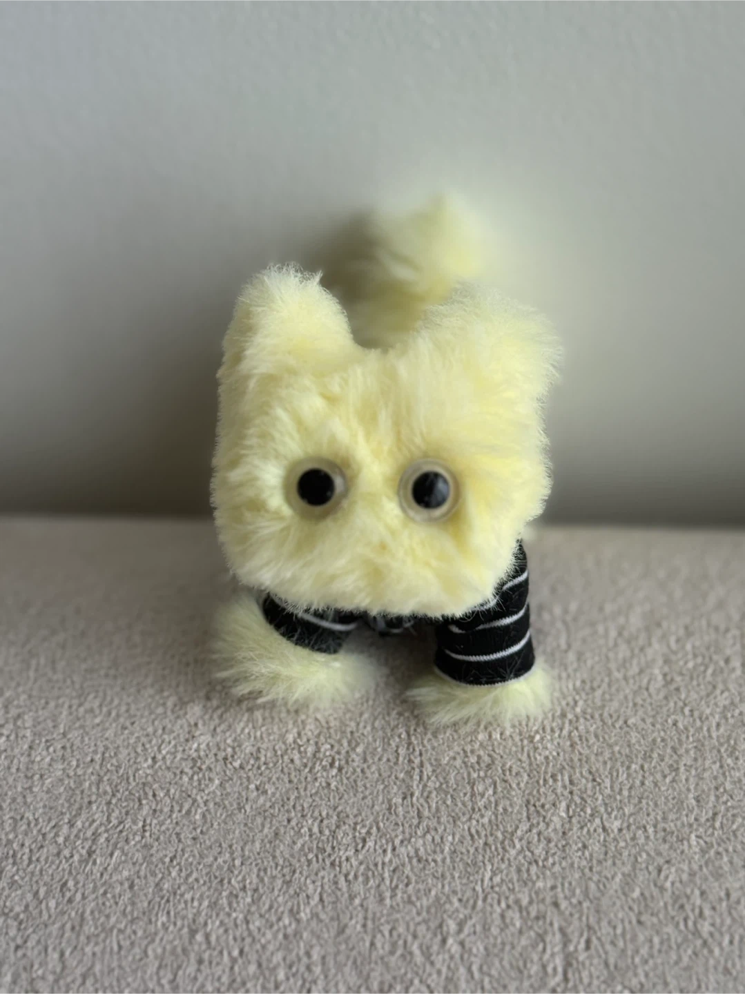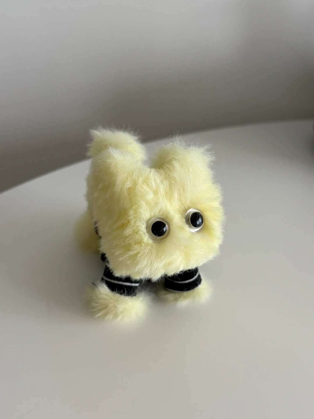 Hi there! I'm selling this super cute yellow Moru doll keyring. It’s a handmade item with a very soft, fluffy texture. I made it myself and this is the only one in Toronto! It's very special✨It features big, lovely eyes and is wearing a stylish black striped shirt.