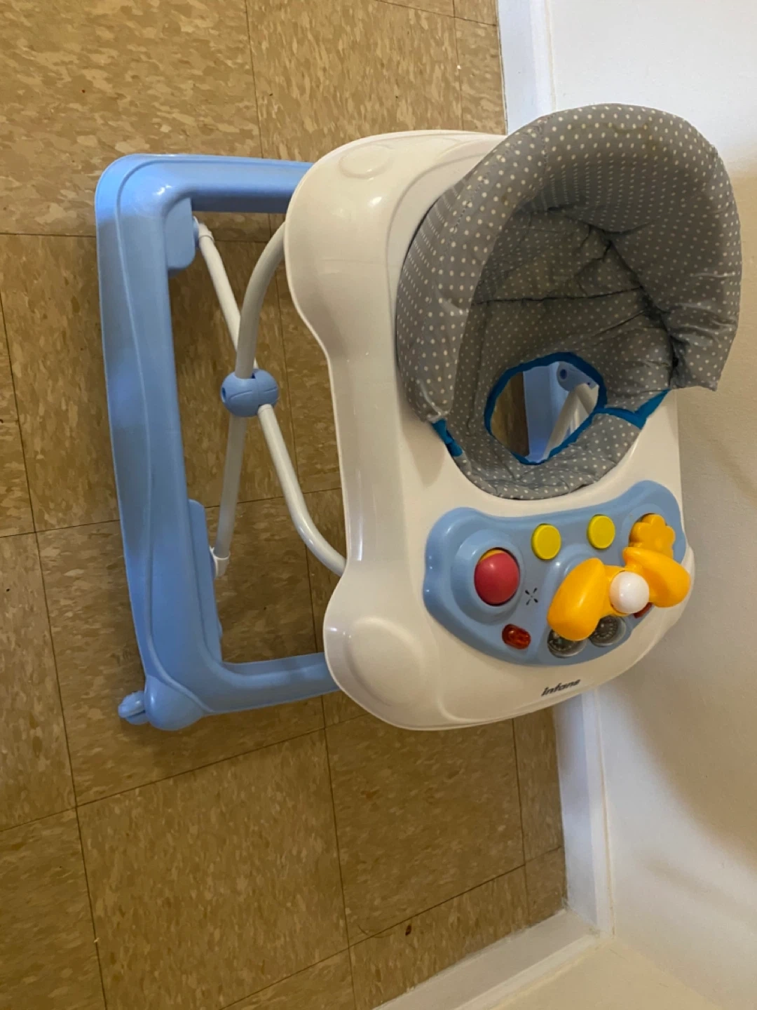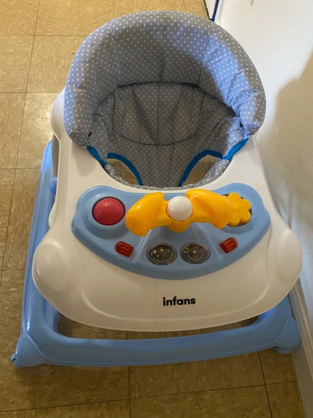 This Infans baby walker features a blue and white design with a gray polka dot seat. It has a removable play tray with interactive toys. The walker's seat is padded for comfort. It's designed to help babies learn to walk.