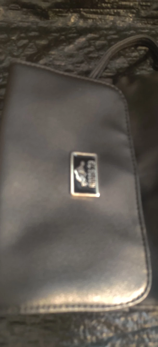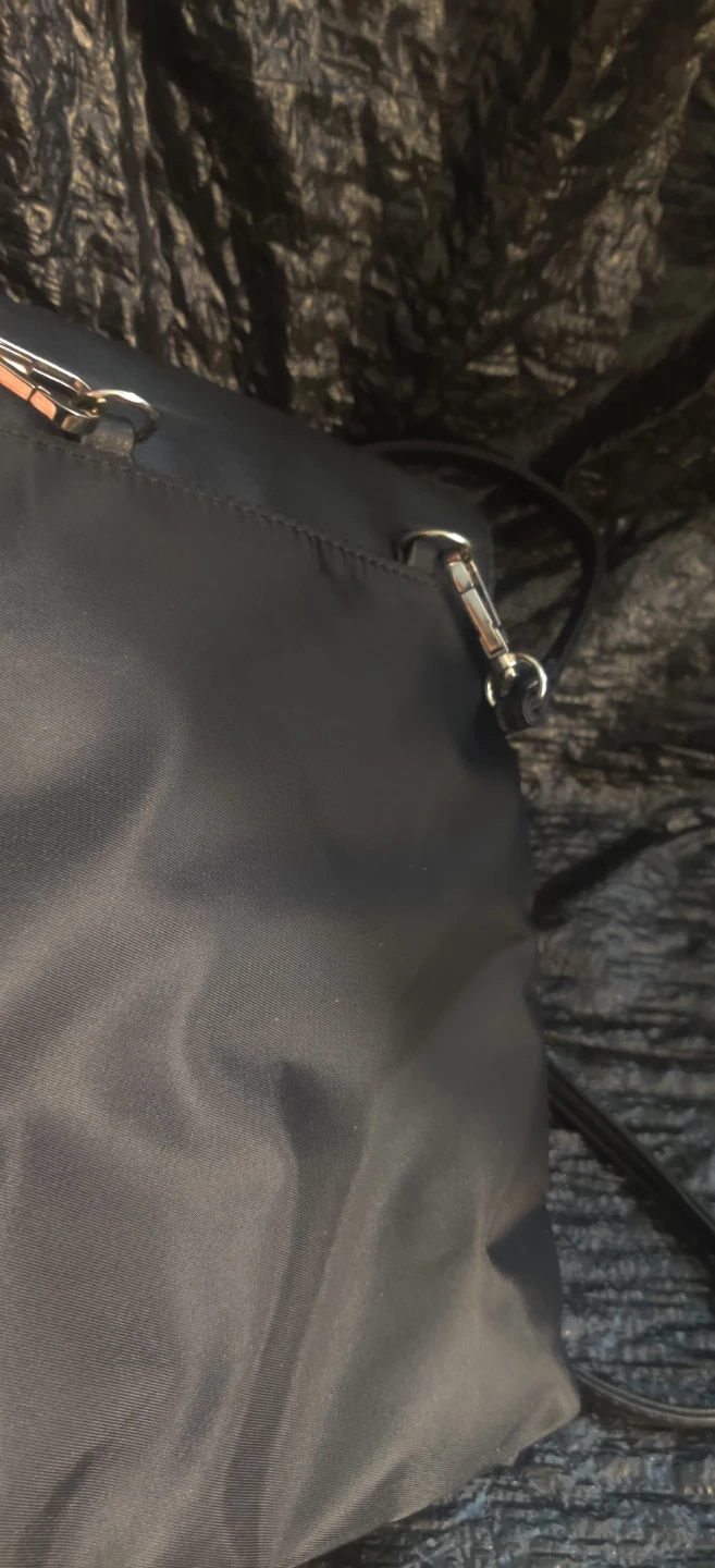 This is a black shoulder bag. It has a flap closure with a metal clasp. The interior lining has a repeating brand name pattern.Large outside pocket but no inside pocket. Bag is new without tags