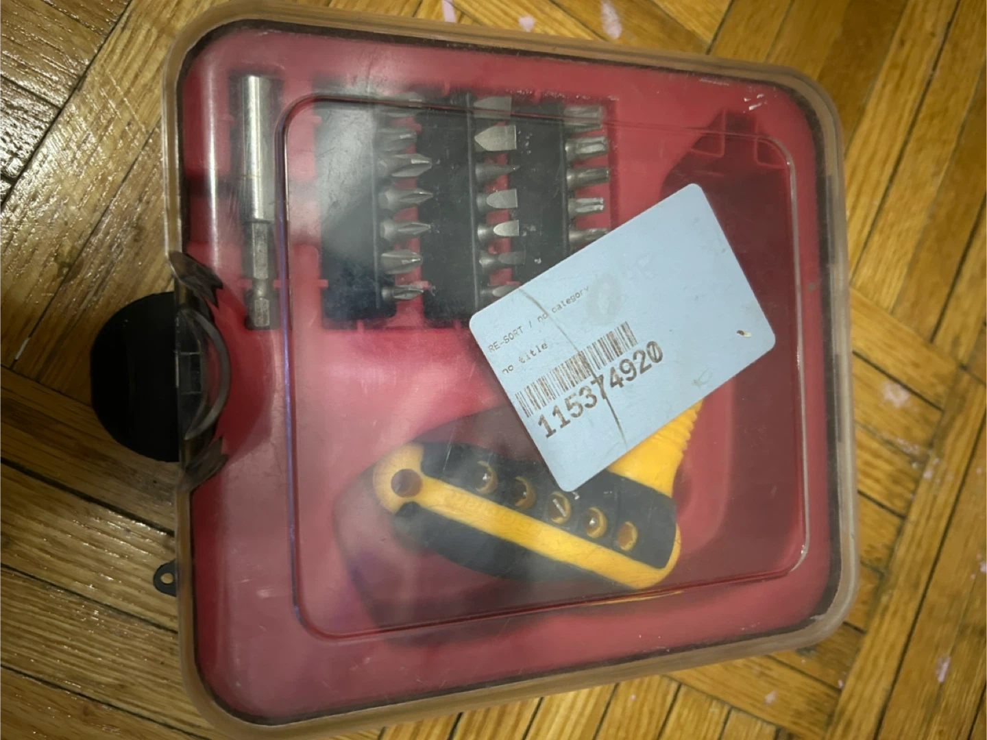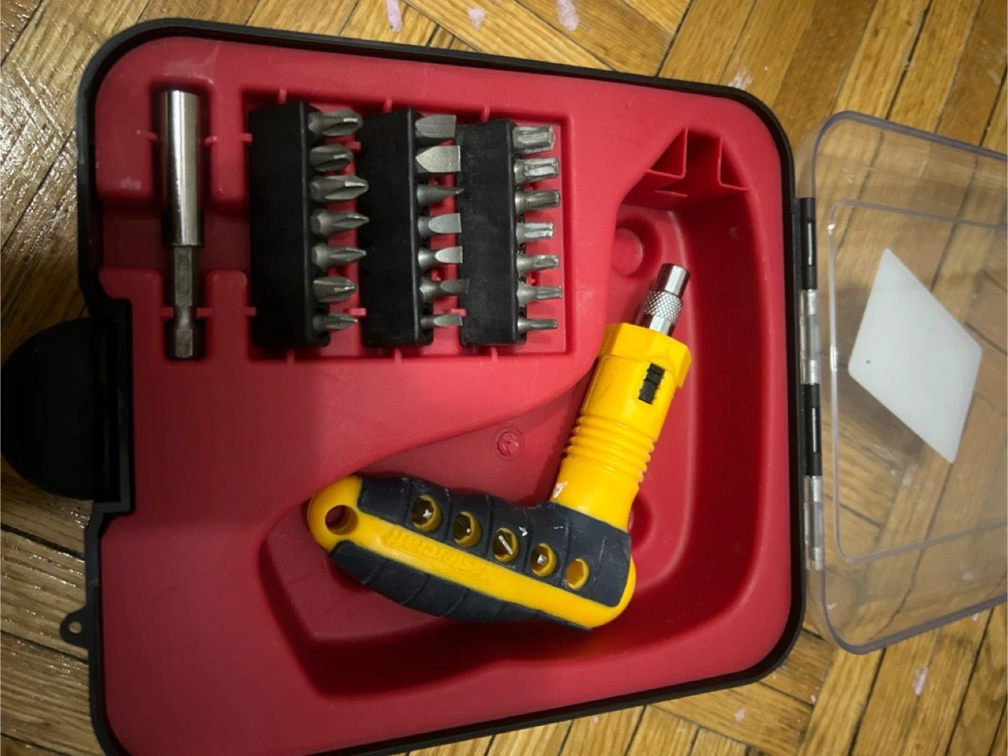 This set includes a ratchet screwdriver handle and a variety of bits. All pieces come organized in a durable red and clear case. It's handy for quick repairs and assembly projects around the house.