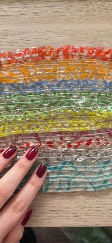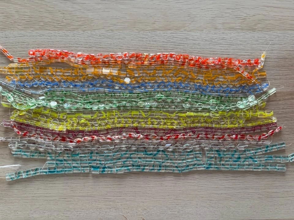 Over 100 strands of vibrant glass beads (not all shown in the picture). Each strand is about 40cm long. Mix of shapes (round, oval, rectangular) with colorful speckles. Perfect for bracelets, necklaces, and DIY crafts.