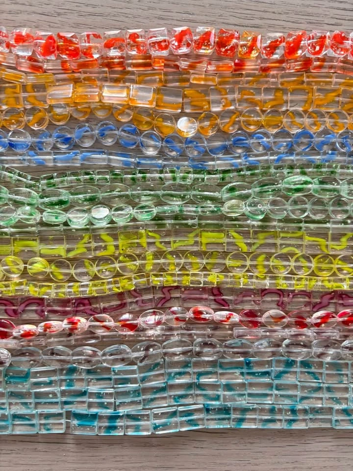 Over 100 strands of vibrant glass beads (not all shown in the picture). Each strand is about 40cm long. Mix of shapes (round, oval, rectangular) with colorful speckles. Perfect for bracelets, necklaces, and DIY crafts.