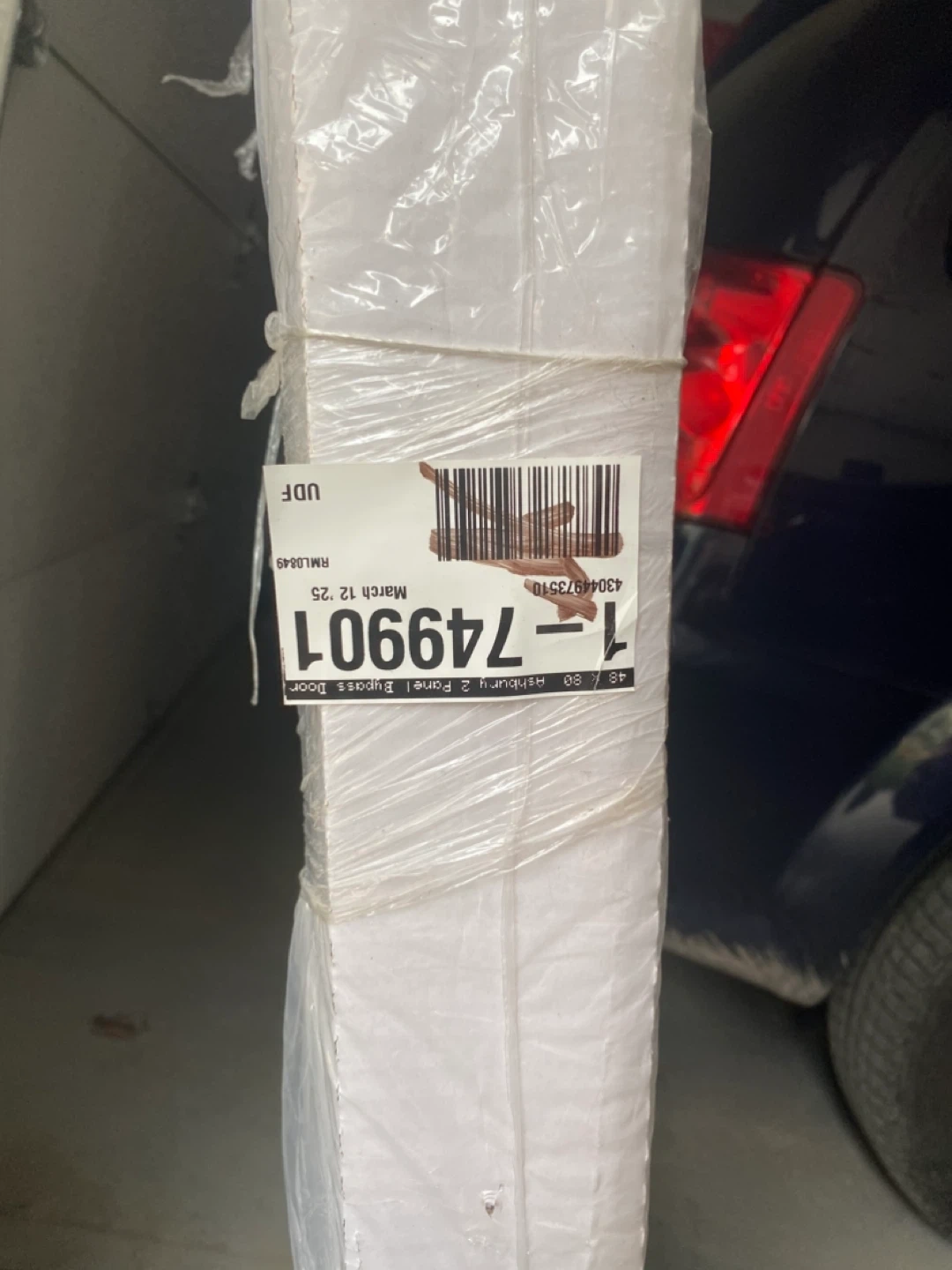 Selling an Ashbury 2 Panel Bi-Pass Door still in its original packaging. The label shows a date of March 12, 2025.