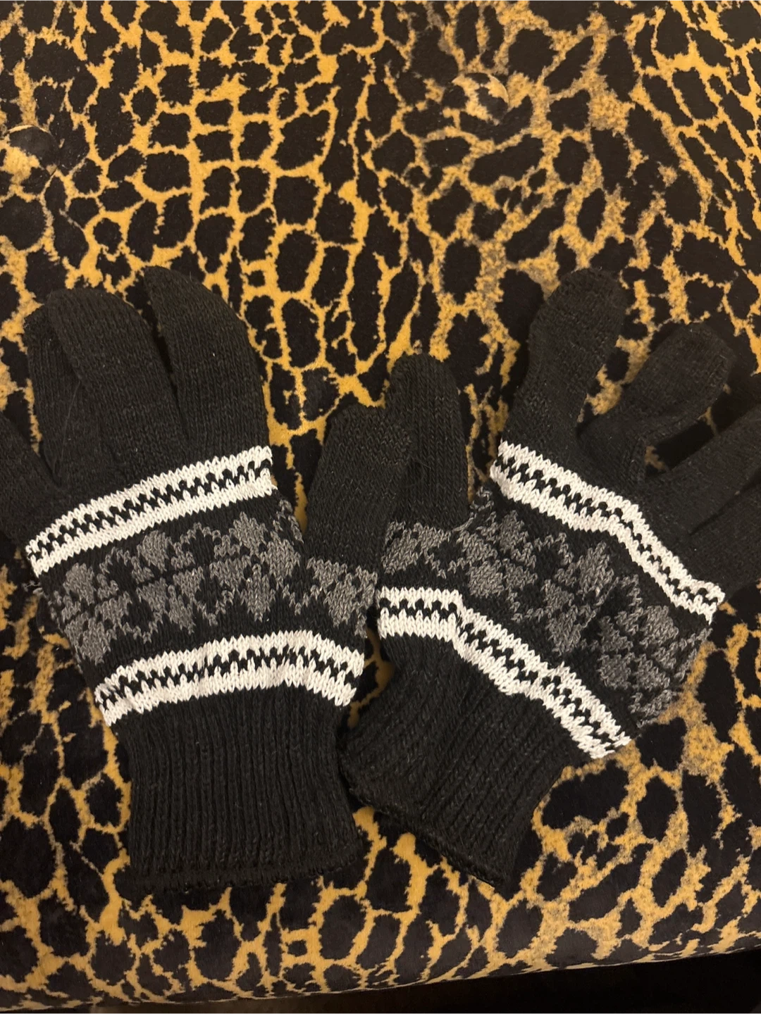 Cozy black knit gloves featuring a white and grey Fair Isle pattern around the cuffs. They're made of a soft, warm material. Perfect for keeping your hands warm on chilly days!
