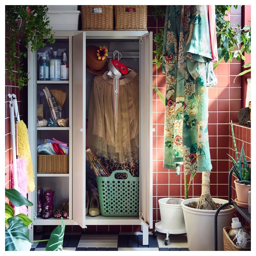 This metal cabinet is great for storing garden tools and supplies. It features a durable cream-coloured finish and double doors for easy access. Several shelves inside help organize items, and it's perfect for keeping your outdoor gear tidy.