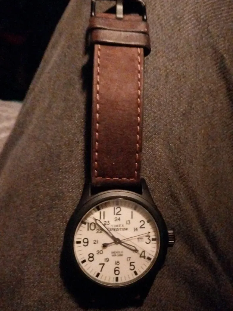 This is a Timex Expedition watch with a brown leather strap. It features a white dial with black numbers and a black casing. The watch has a 24-hour display and INDIGLO night-light. It's suitable for everyday wear.