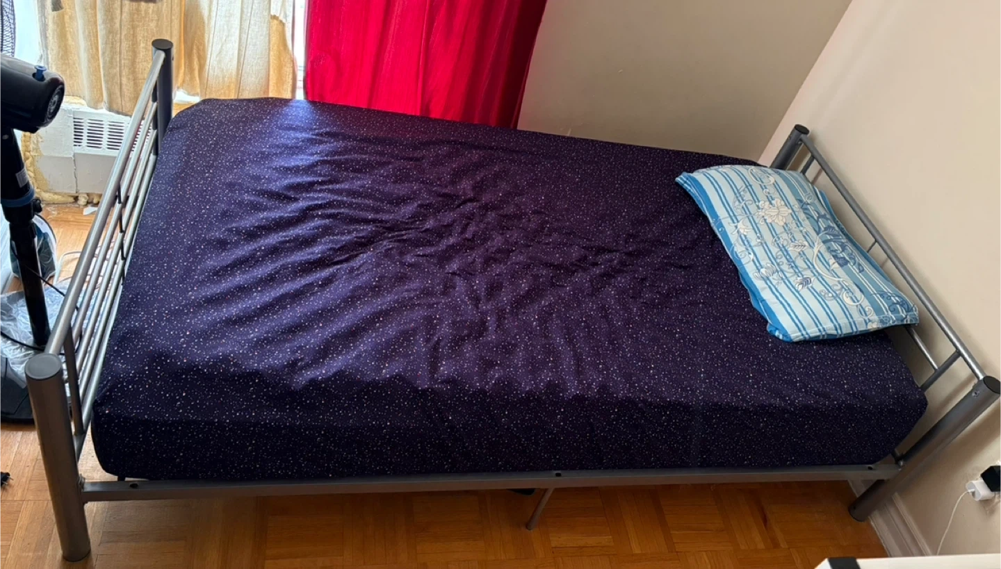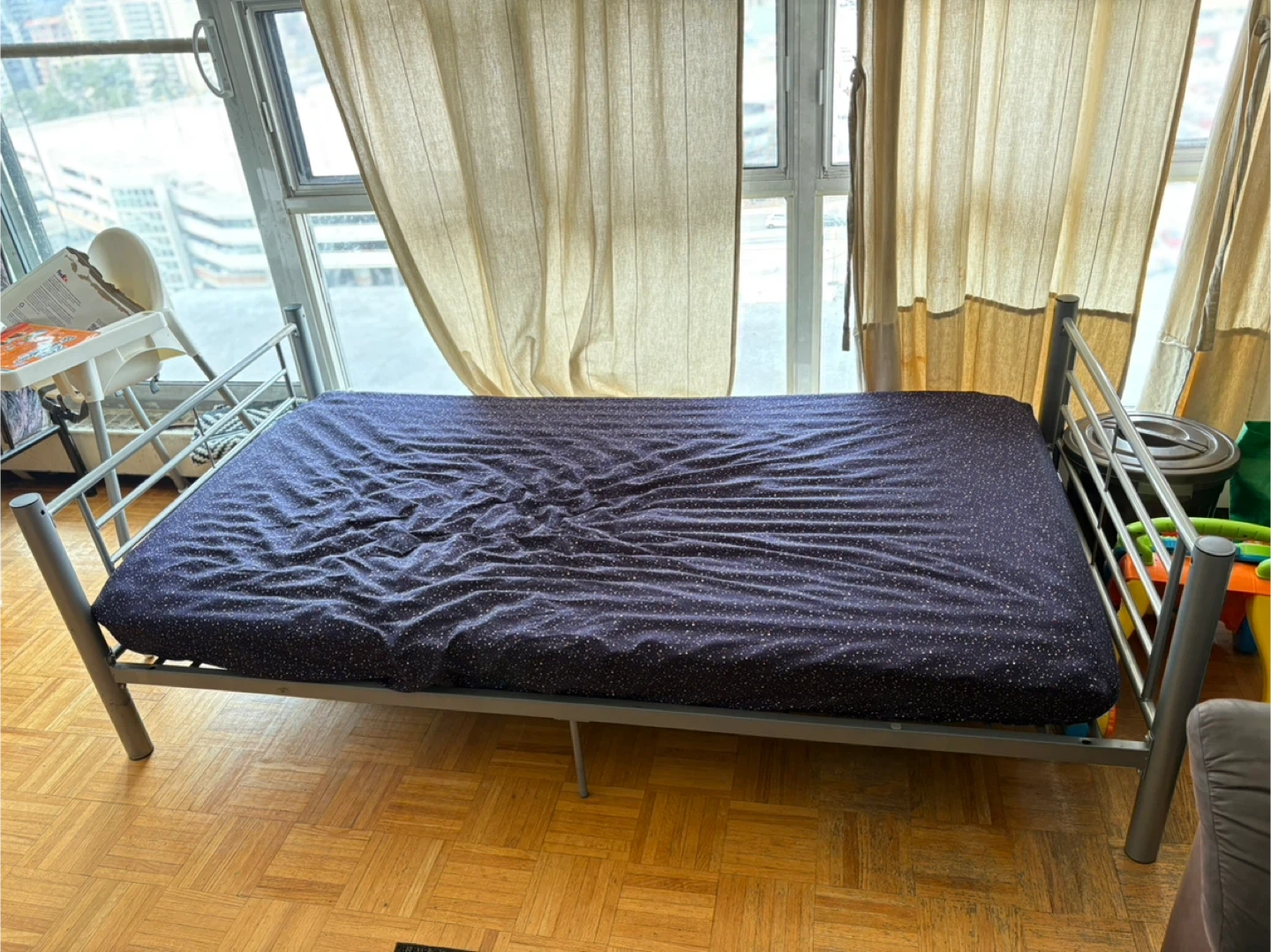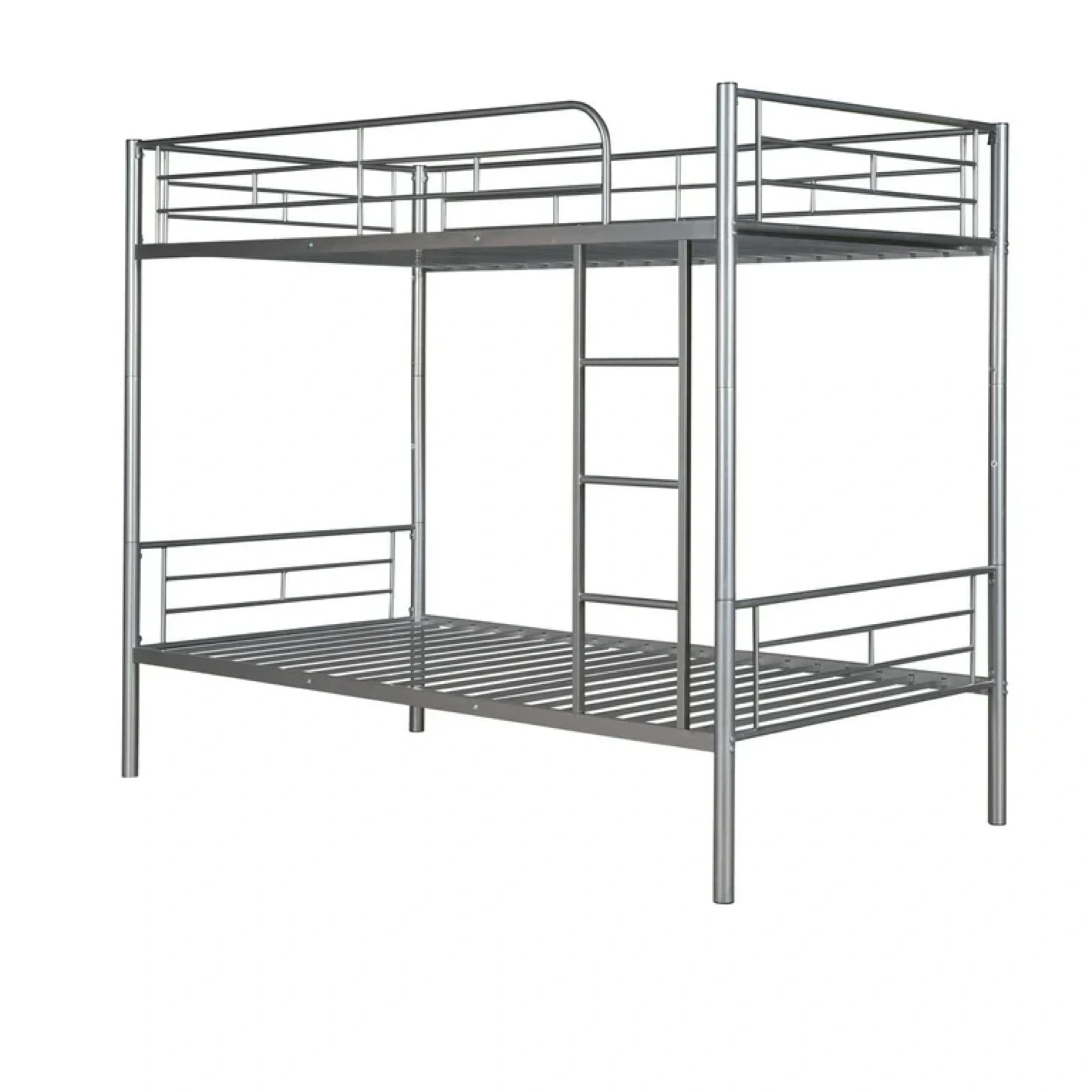 This is a silver metal bunk bed frame. It's made of durable metal tubing. The frame includes a ladder for access to the top bunk. Great for saving space!
