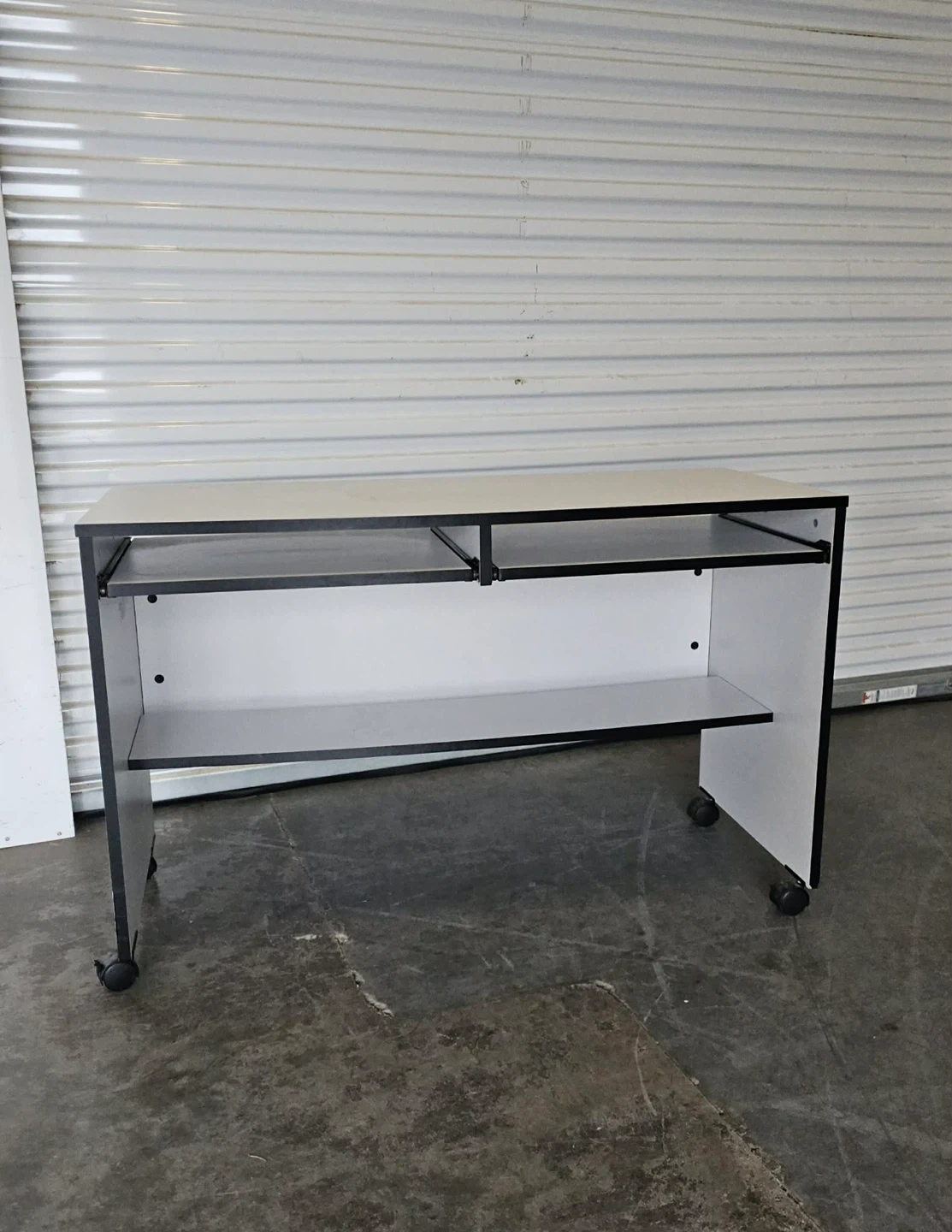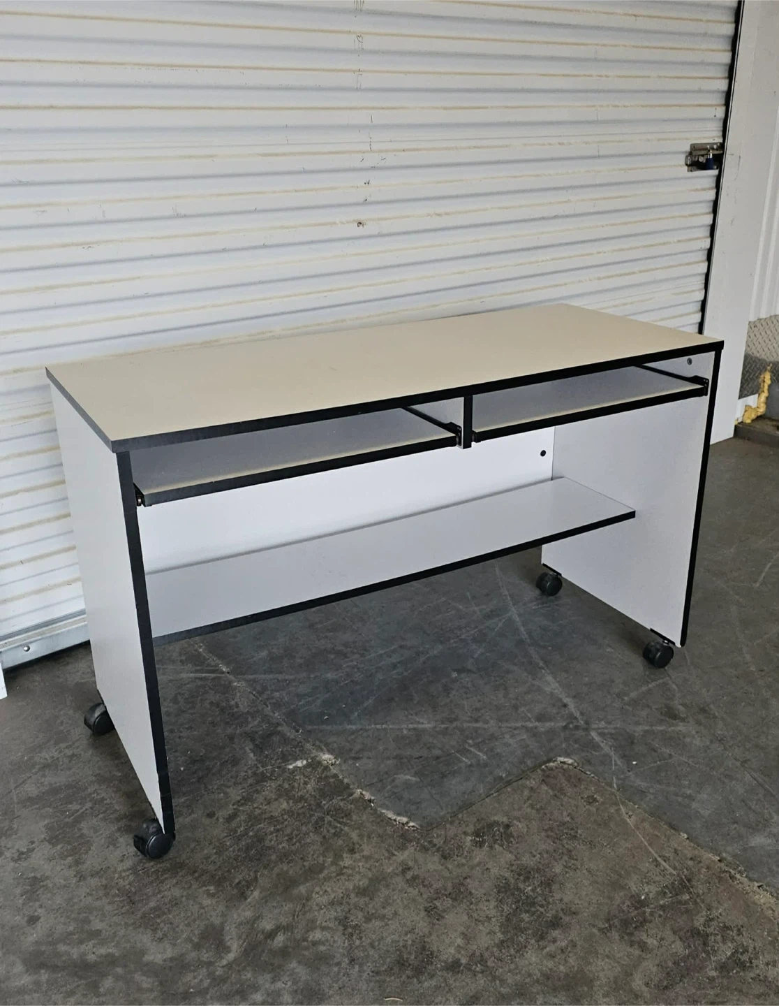 White Melamine desk/work station on castors - 31h × 21d