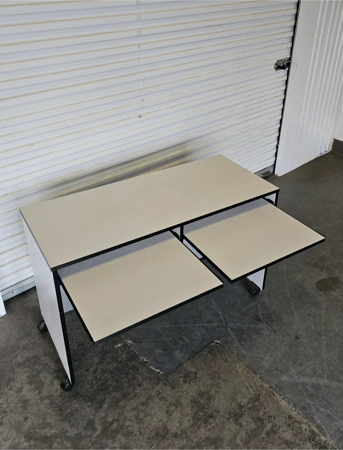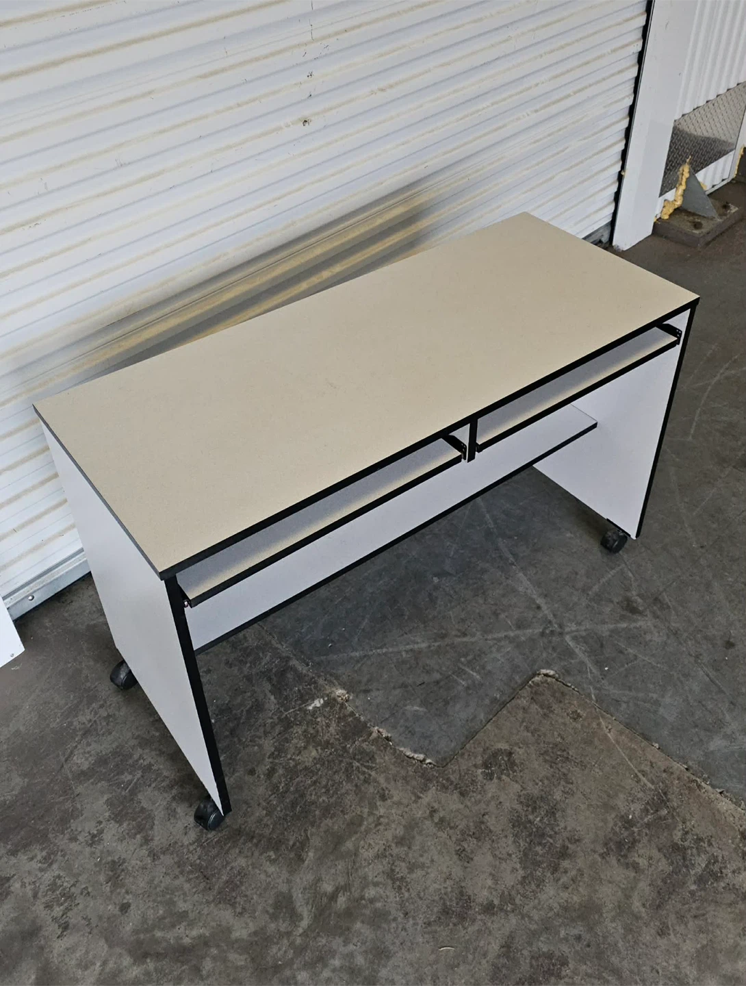 White Melamine desk/work station on castors - 31h × 21d