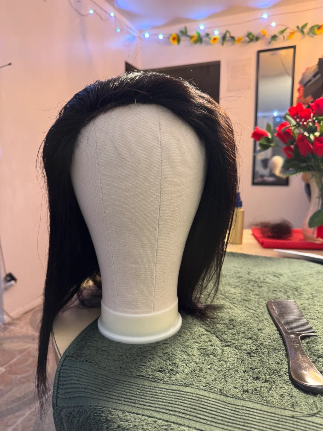 This is a black, straight wig with a bob cut. It features a lace front for a natural look. Included combs for secure fit.