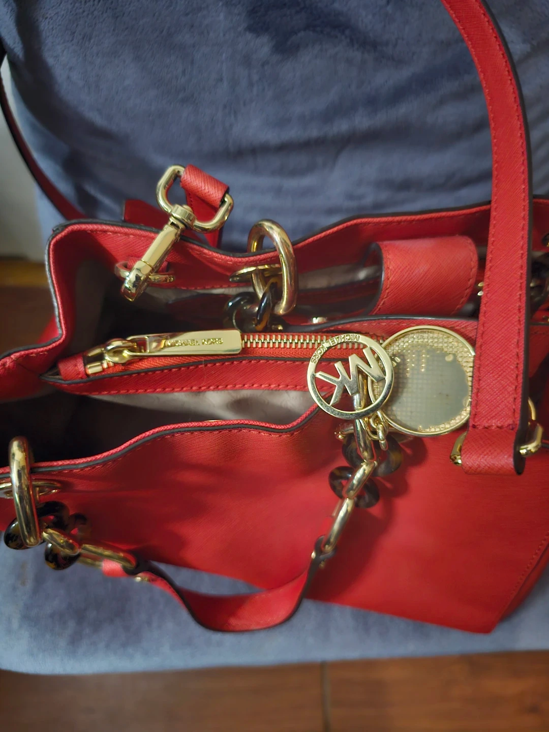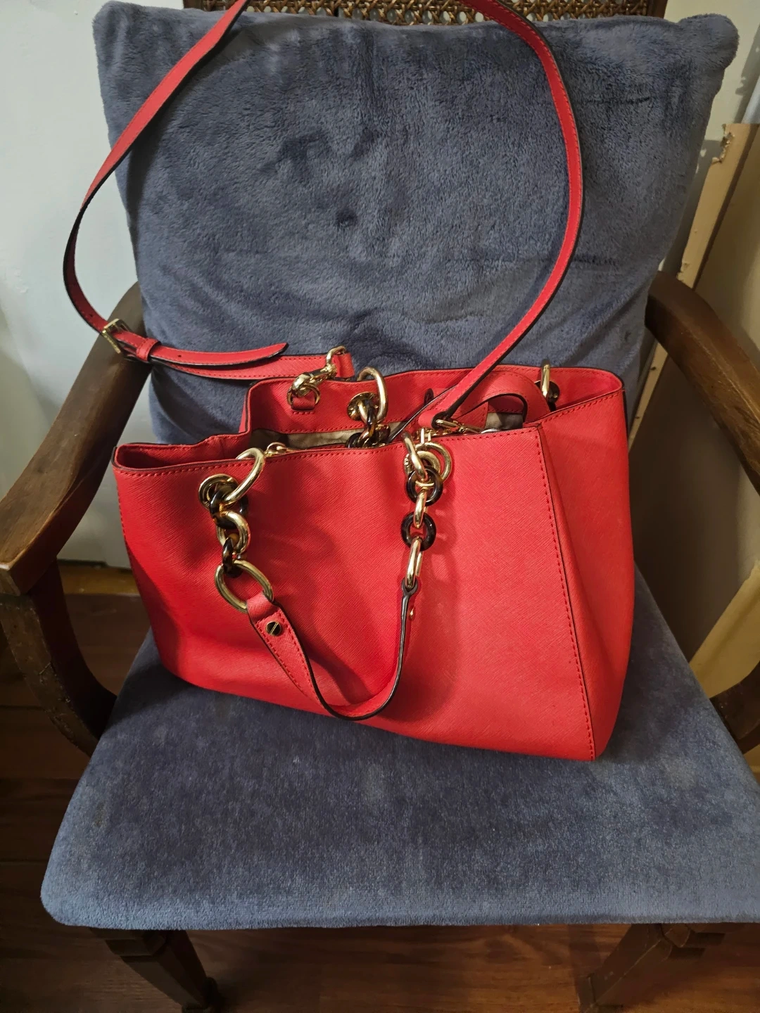 This Michael Kors satchel is made of red Saffiano leather. It features gold-tone hardware and a removable crossbody strap. Interior includes multiple pockets.