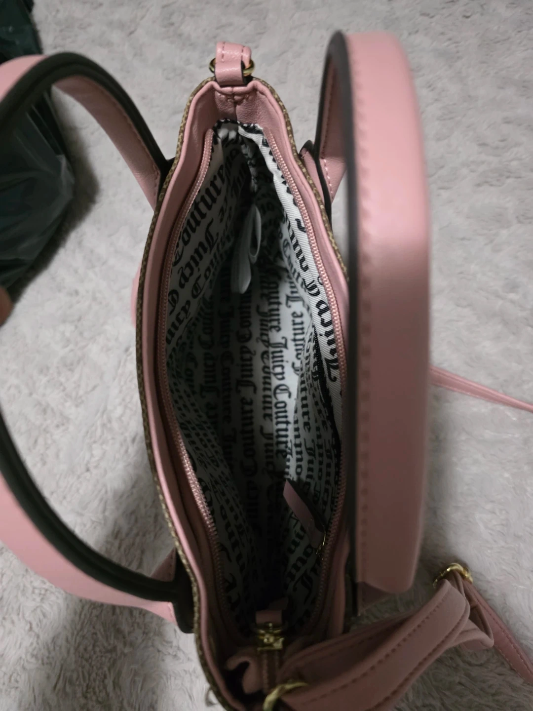 This Juicy Couture bag features a signature monogram print and pink accents. It has top handles and an adjustable shoulder strap for versatility. The interior lining is also printed with the Juicy Couture logo.