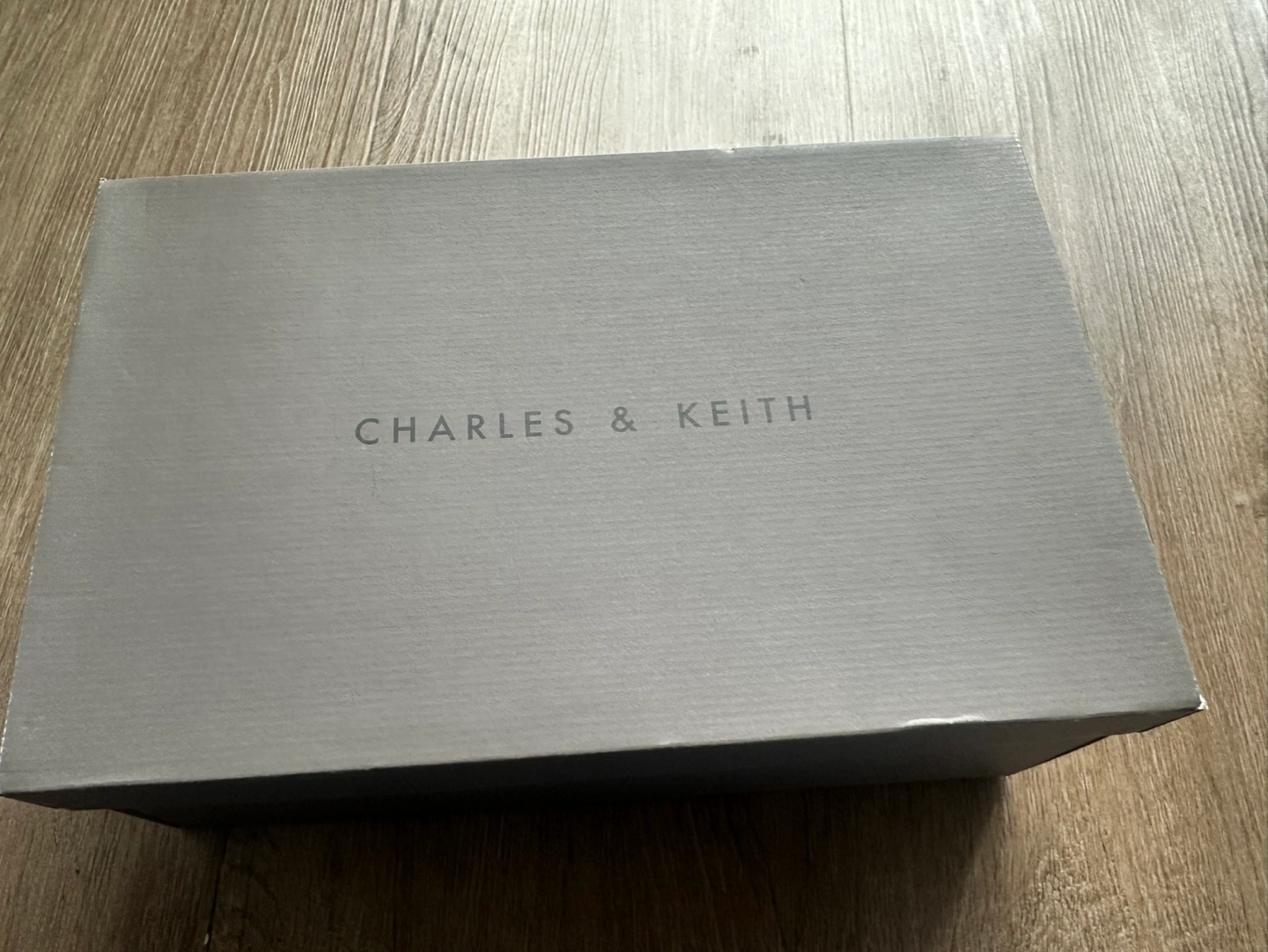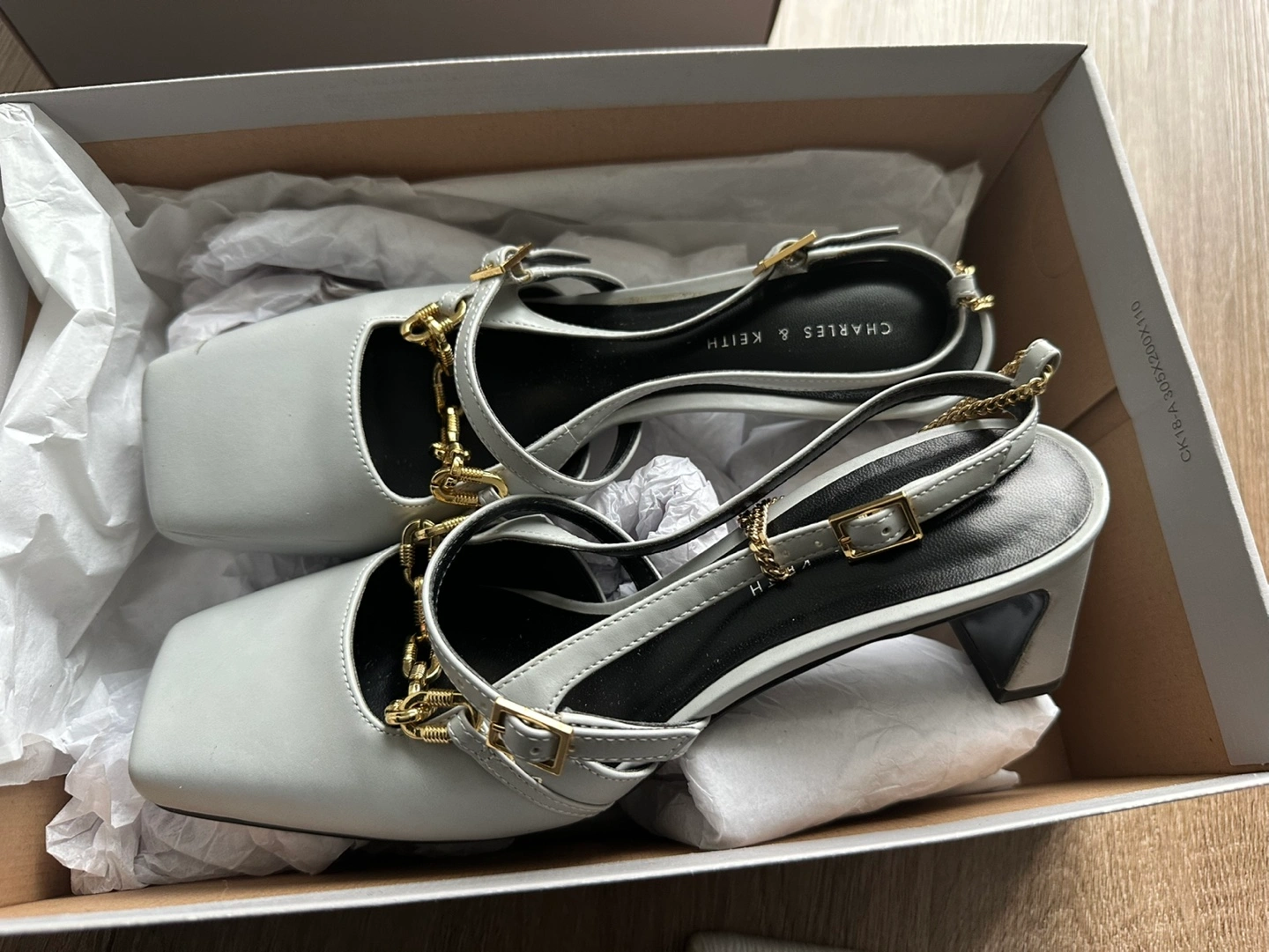 Slightly used Charles & Keith light grey slingback heels. Size 35. Covered open-back pump with chain detail. Comes in original box.