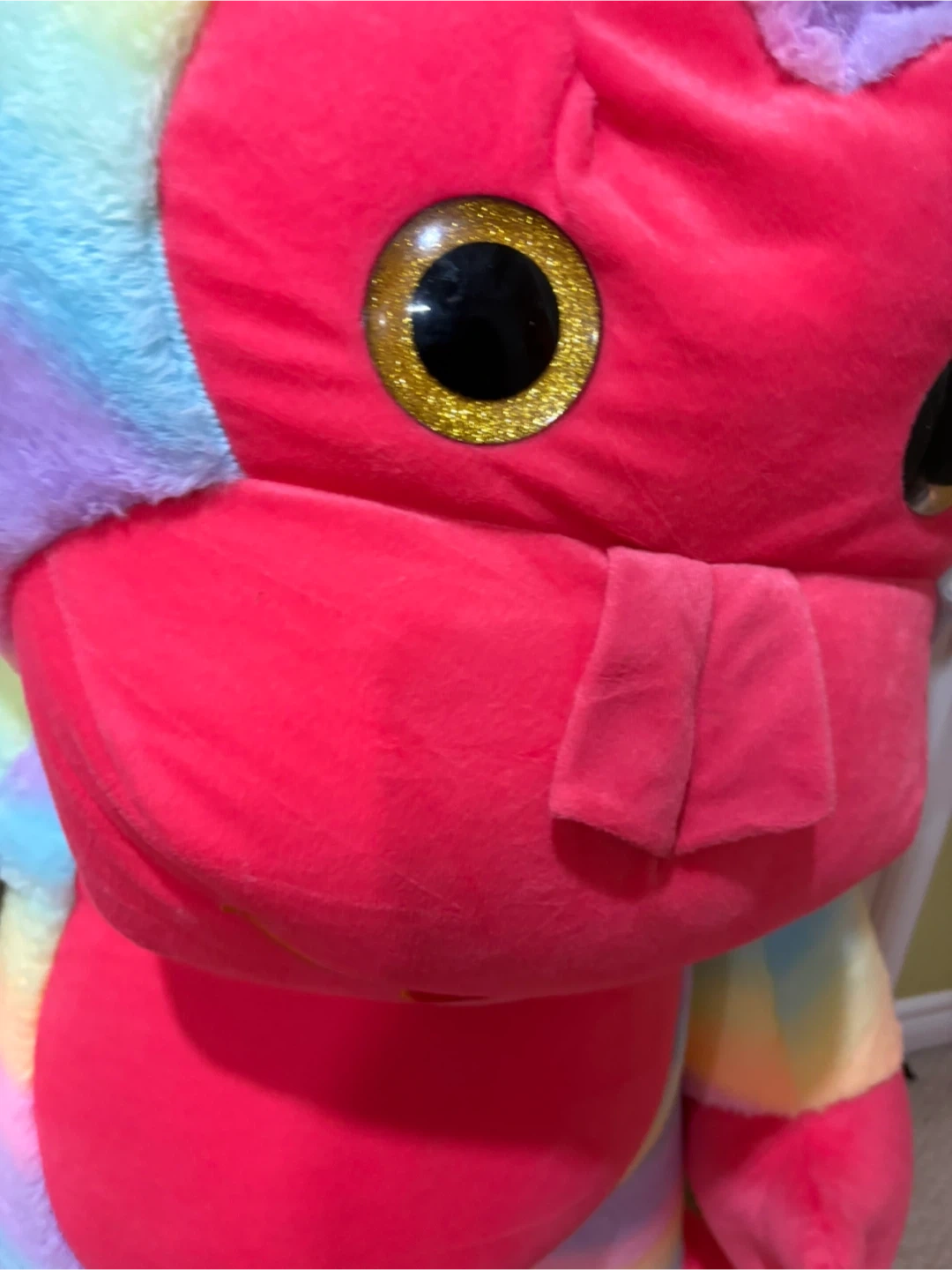 This is a large, cuddly rainbow-coloured monkey plush toy. It has bright pink accents and big sparkly eyes. It's super soft and ready for hugs!