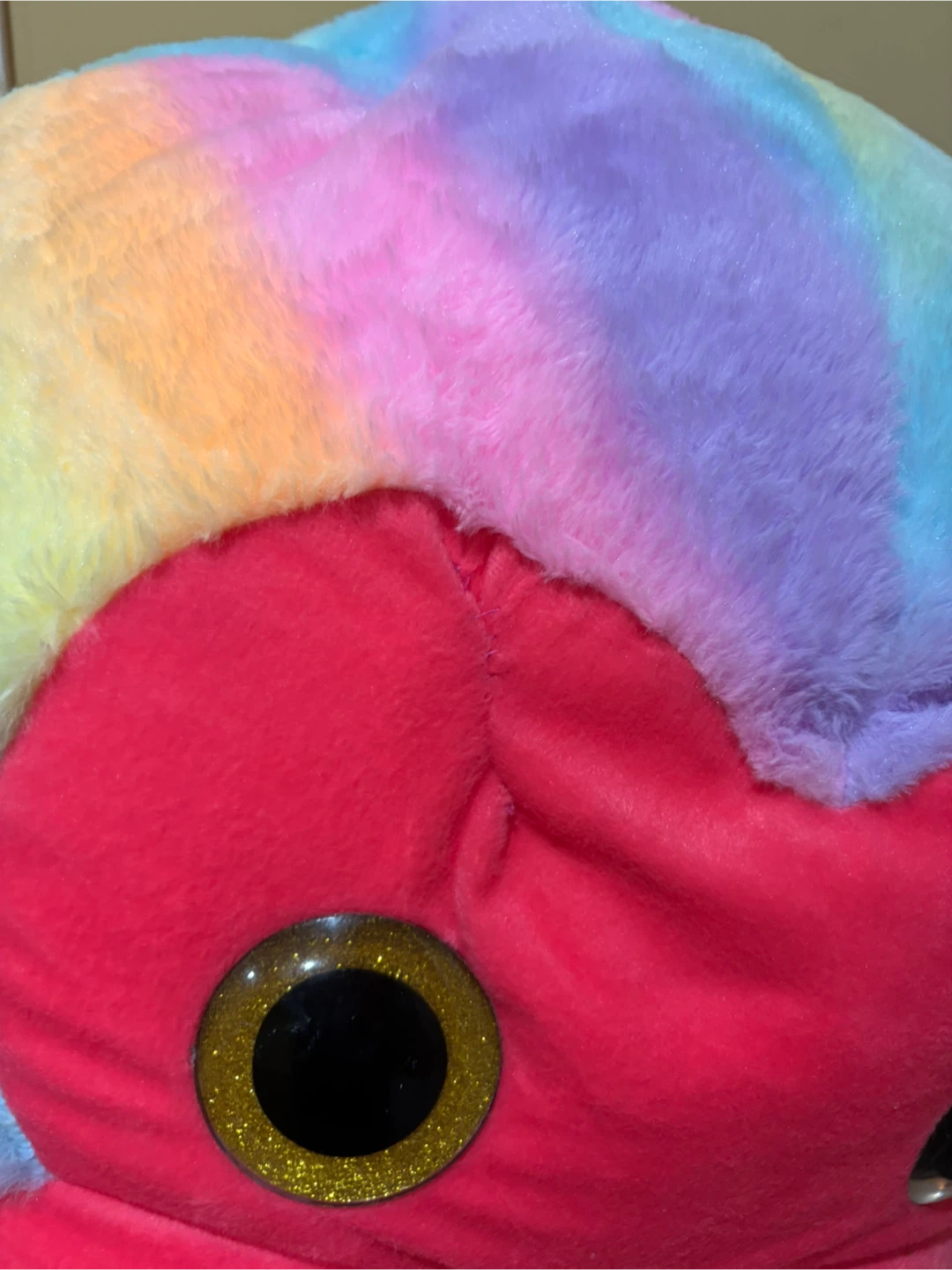 This is a large, cuddly rainbow-coloured monkey plush toy. It has bright pink accents and big sparkly eyes. It's super soft and ready for hugs!